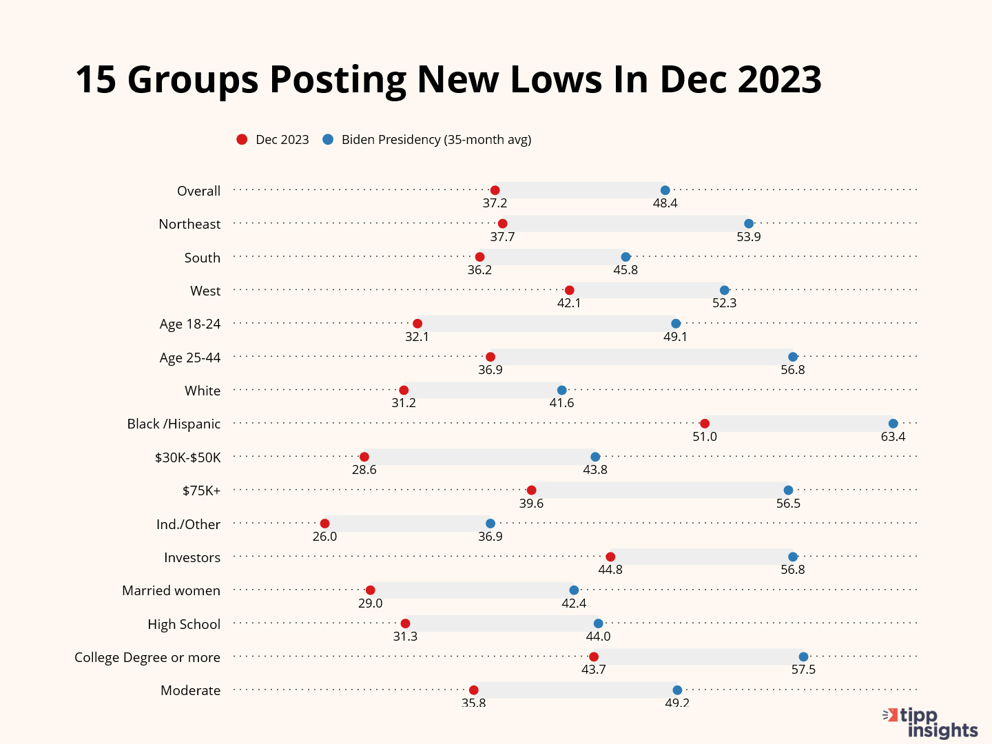 Overall, the index declined by 5.7 points to 37.2 in December, the lowest reading posted during Biden’s 35-month tenure. Among the 36 demographic groups we track, only four posted readings above 50.