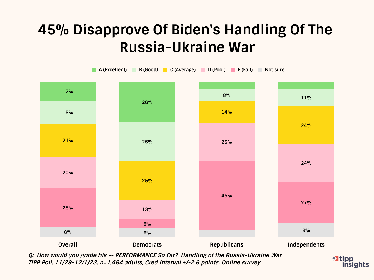 The data echoes the dissatisfaction, with 45% giving him a D or F for handling the war. Only 27% see Biden in a positive light.