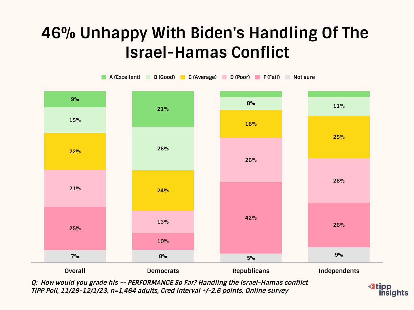 Nearly half (46%) are unhappy with his handling of the Israel-Hamas conflict. Just a quarter (24%) give him good grades.
