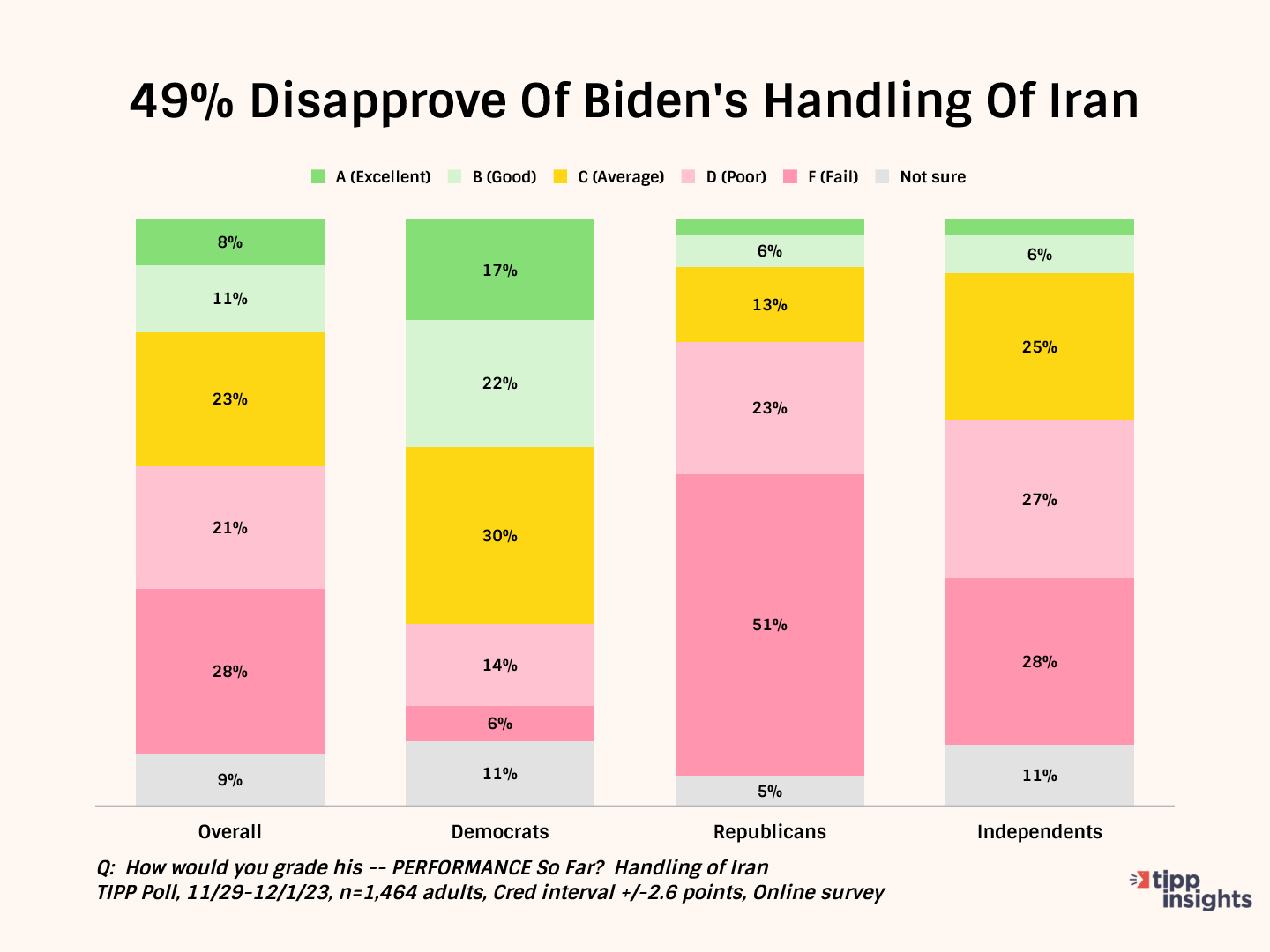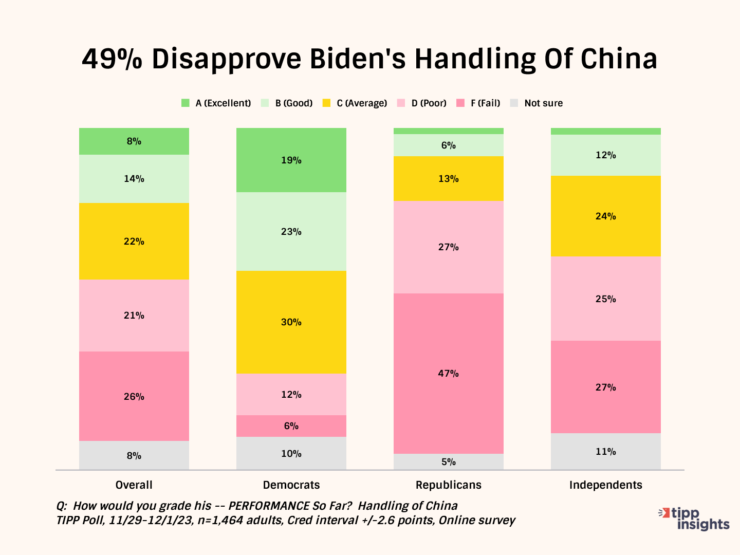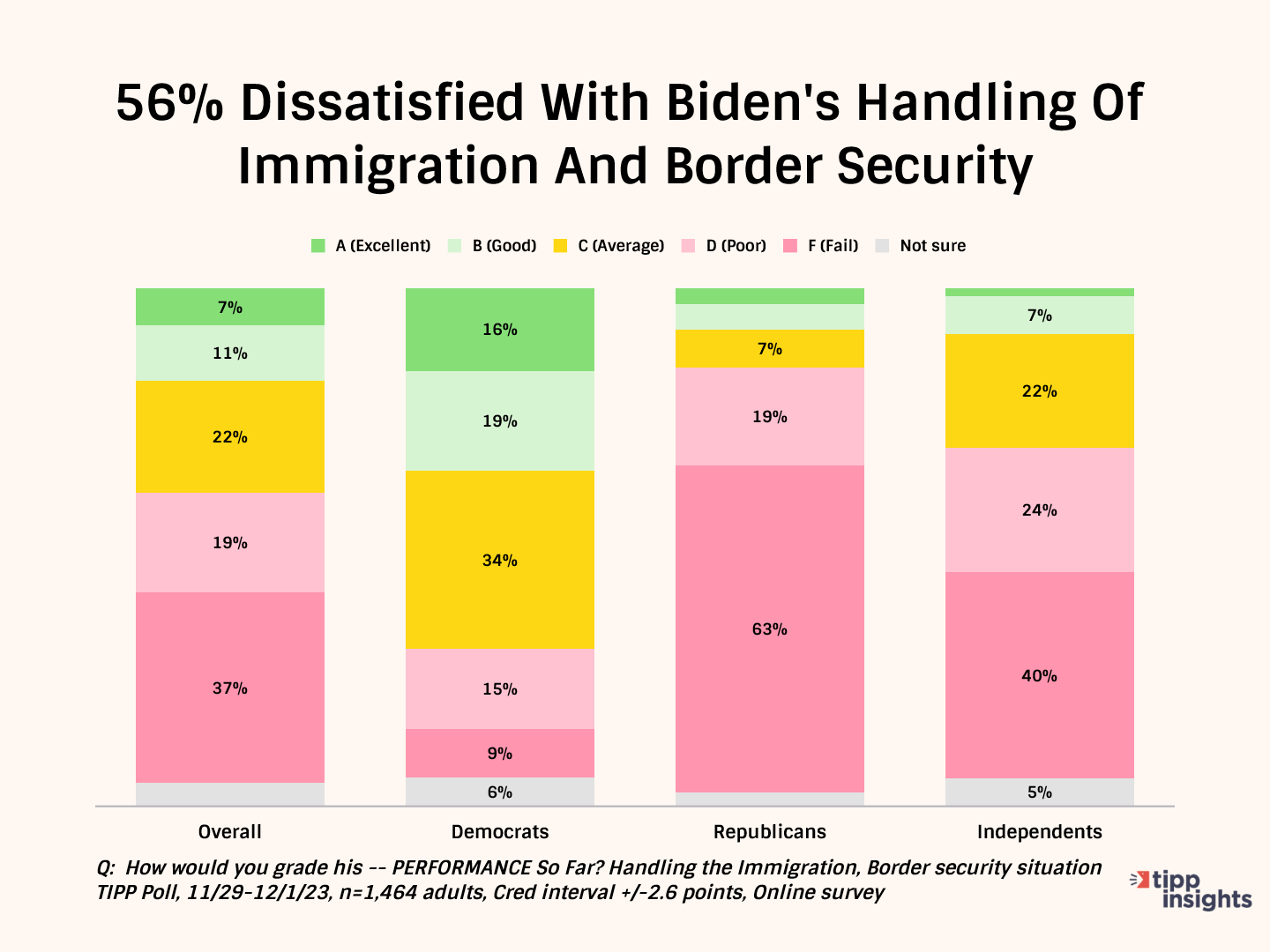 Biden does not even get good grades from a majority of Democrats. Only 47% give him good grades, a testament to his poor performance. Republicans (81%) and independents (63%) give him failing grades.