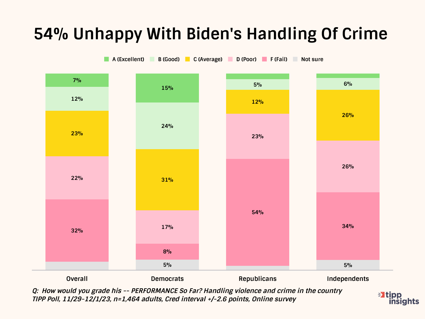 In December, over half (54%) give Biden failing grades for his handling of crime. Only 19% give him an A or B.