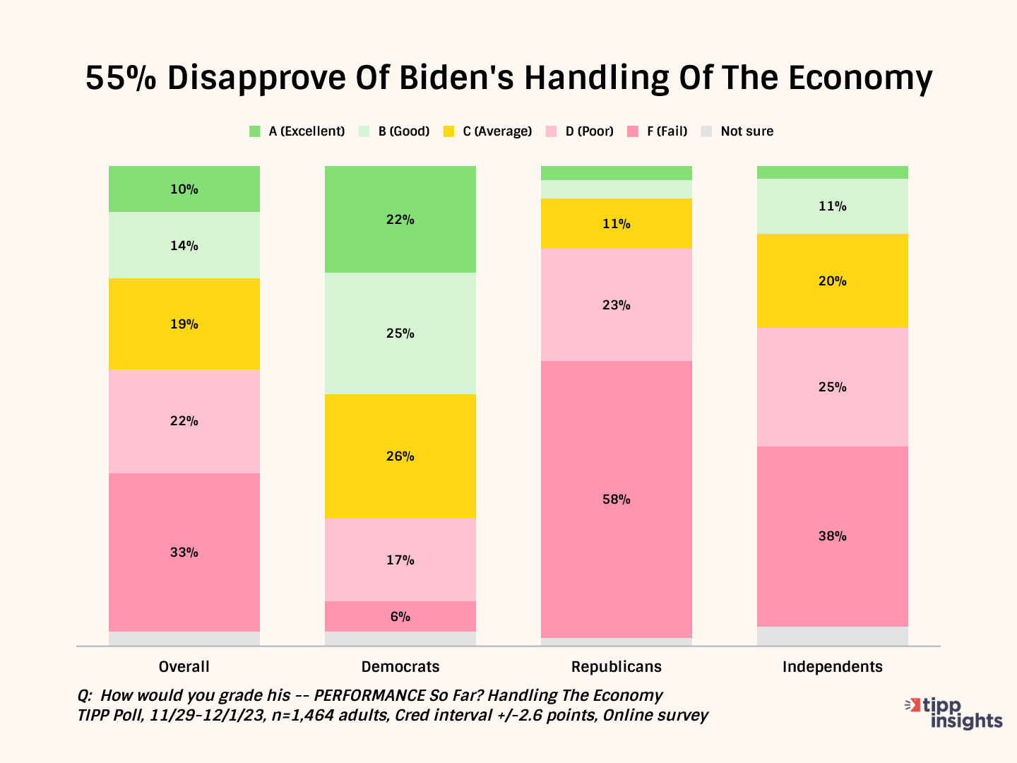 Overall, one-half (55%) give Biden a “D” or “F” for his handling of the economy. Only 24% give him good grades.