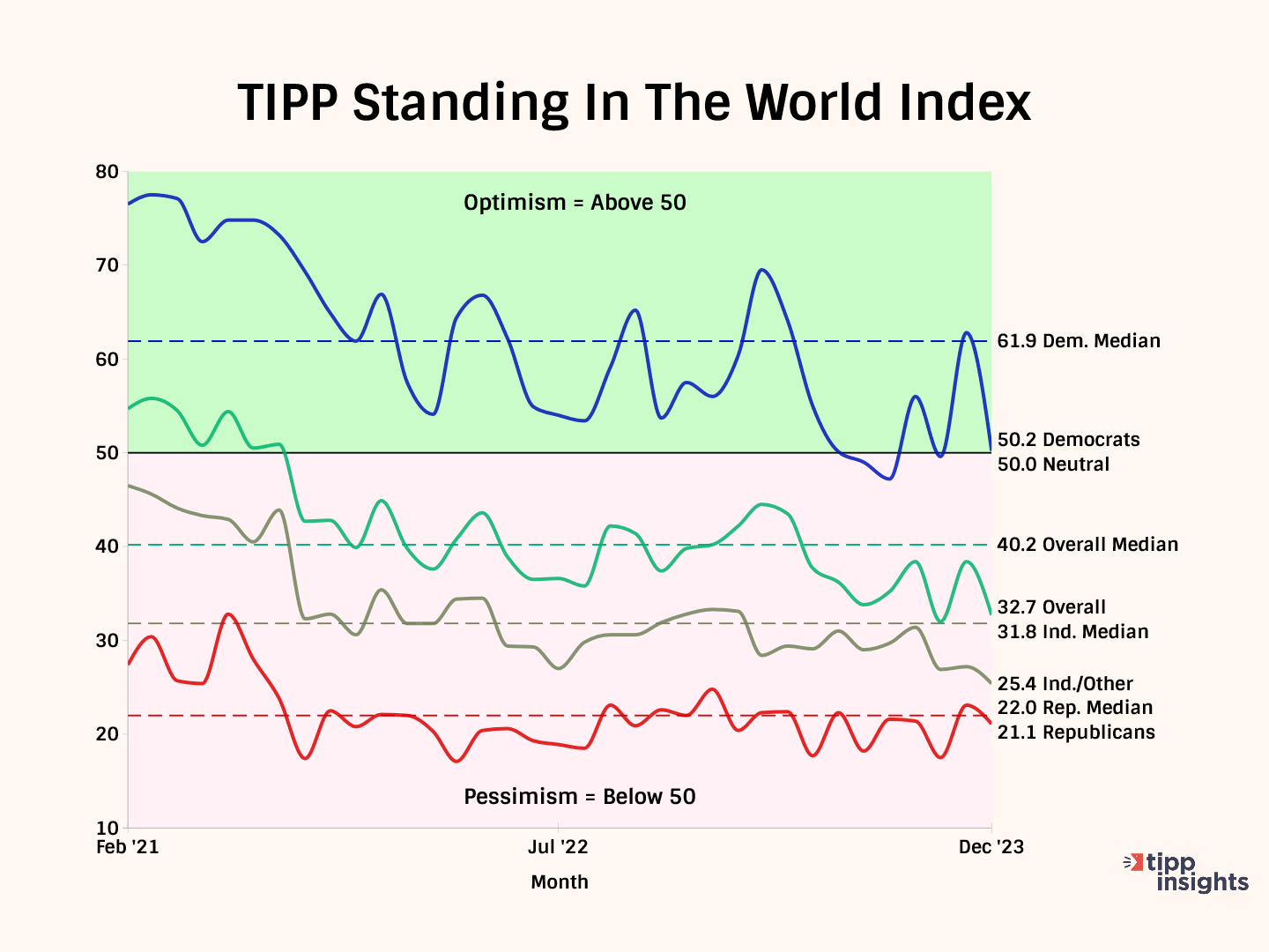 The overall index has been in the pessimistic region since August 2021. In December, Republicans (21.1) and independents (25.4) are pessimistic, while Democrats are barely optimistic at 50.2.