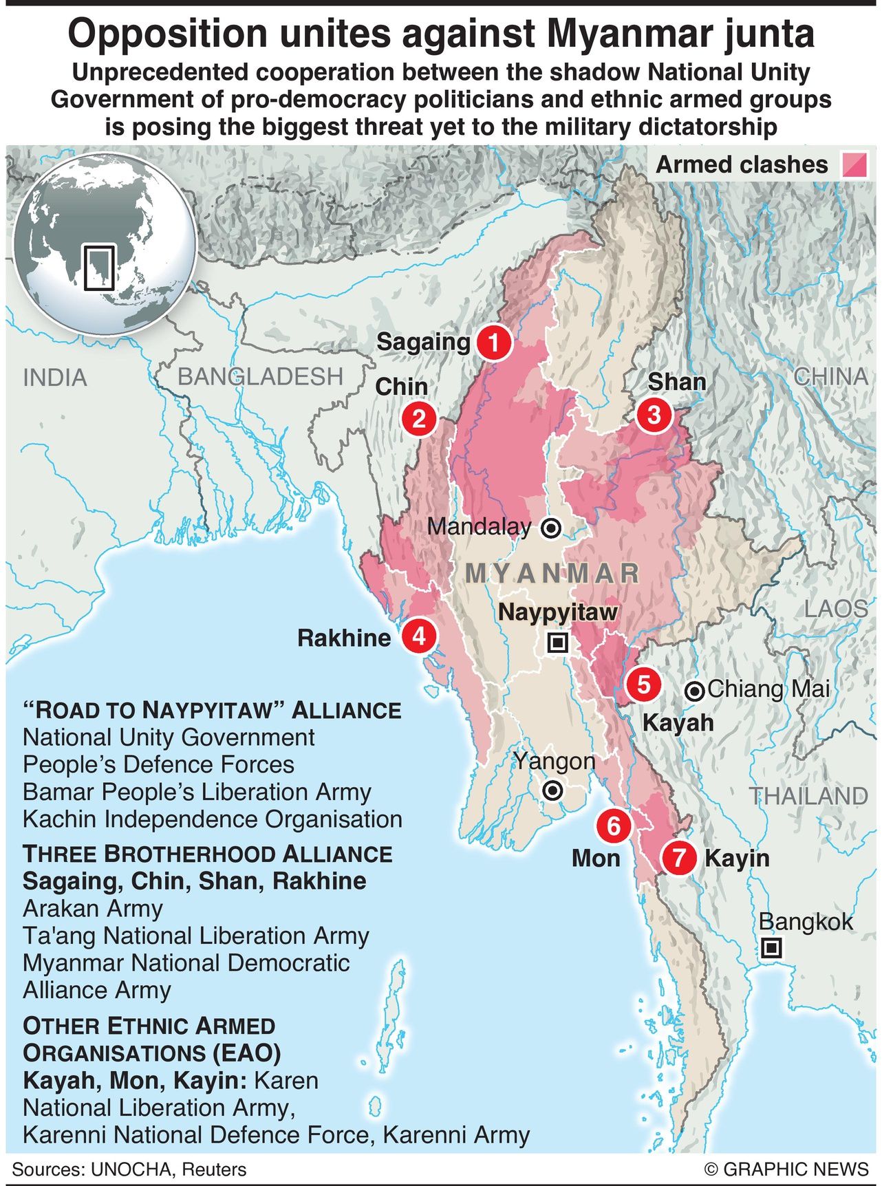 The 2021 coup which brought the ruling junta to power also saw the formation of the parallel National Unity Government by pro-democracy politicians who, and allied with various Ethnic Armed Organisations, has launched a “Road to Naypyitaw” campaign which it says is aimed at taking control of the capital.