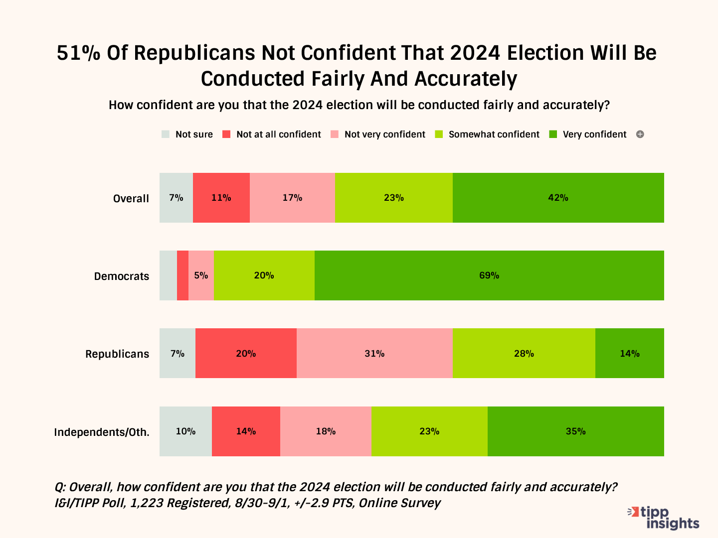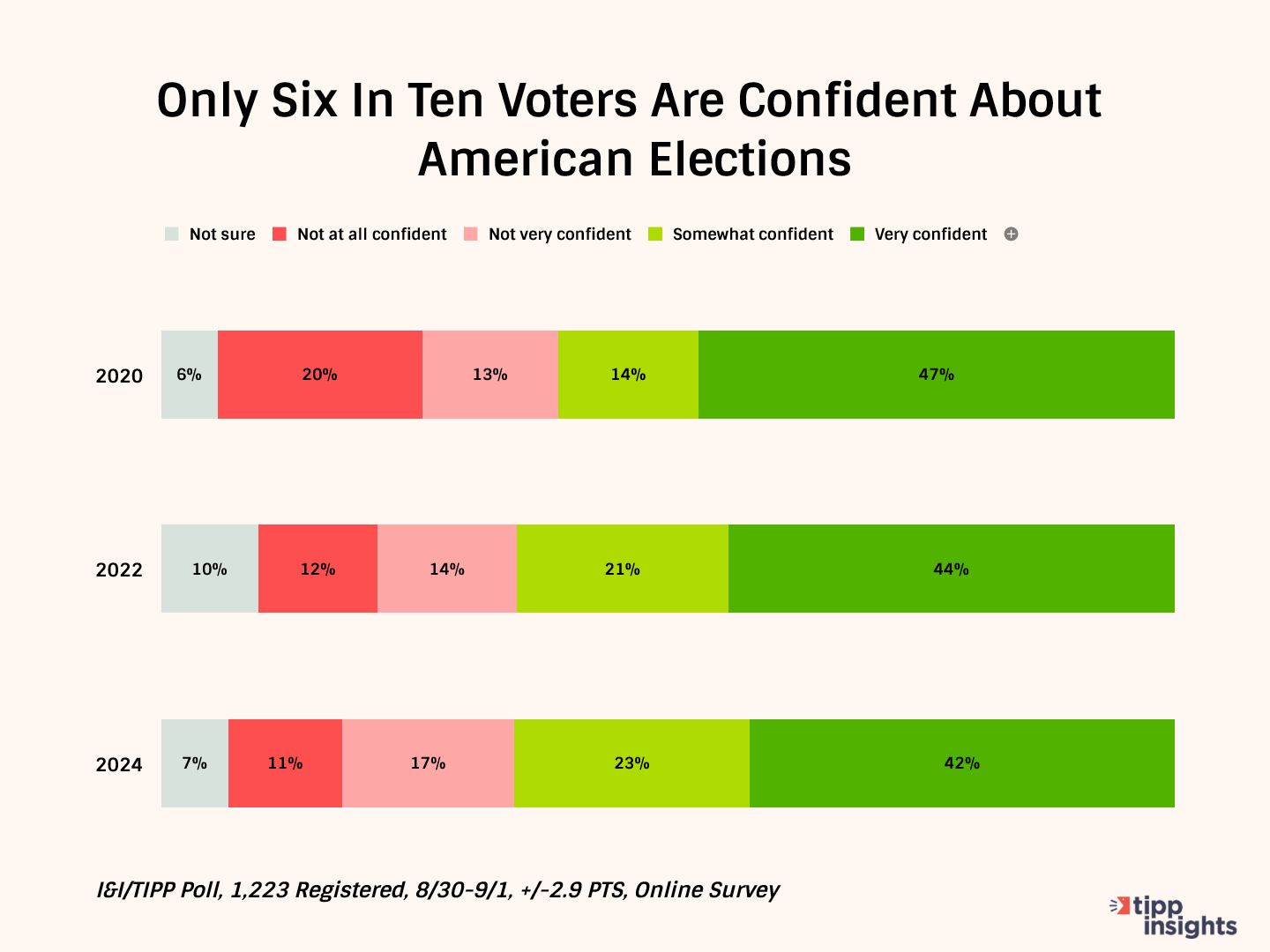 First, the good news: 65% of the 1,223 registered voters queried in the national online I&I/TIPP Poll, which was taken from Aug. 30-Sept. 1, called themselves either "very confident" (42%) or "somewhat confident" (23%) that the 2024 election "will be conducted fairly and accurately."