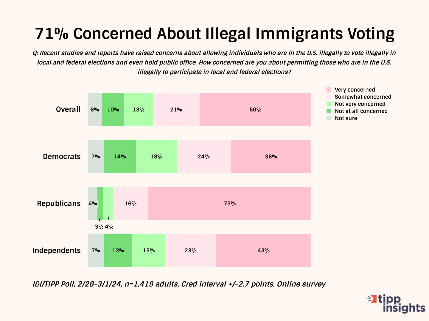 The March national online I&I/TIPP Poll of 1,419 adult registered voters, taken from Feb. 28 to March 1, asked Americans: "How concerned are you about letting those who are in the U.S. illegally to participate in local and federal elections?"