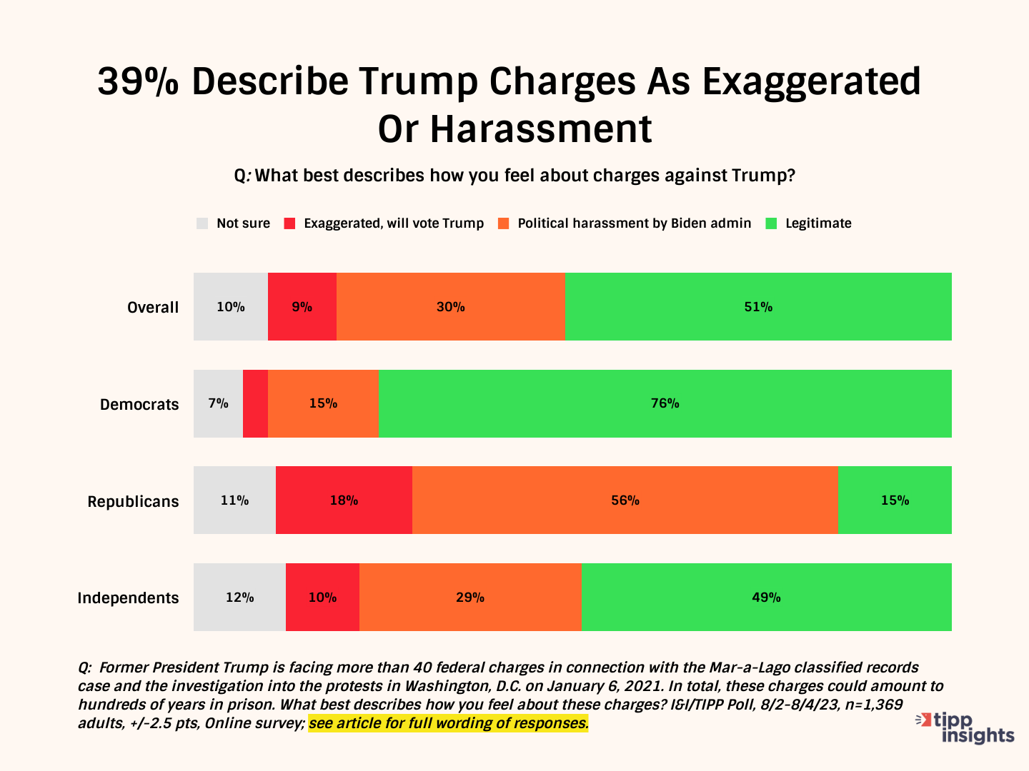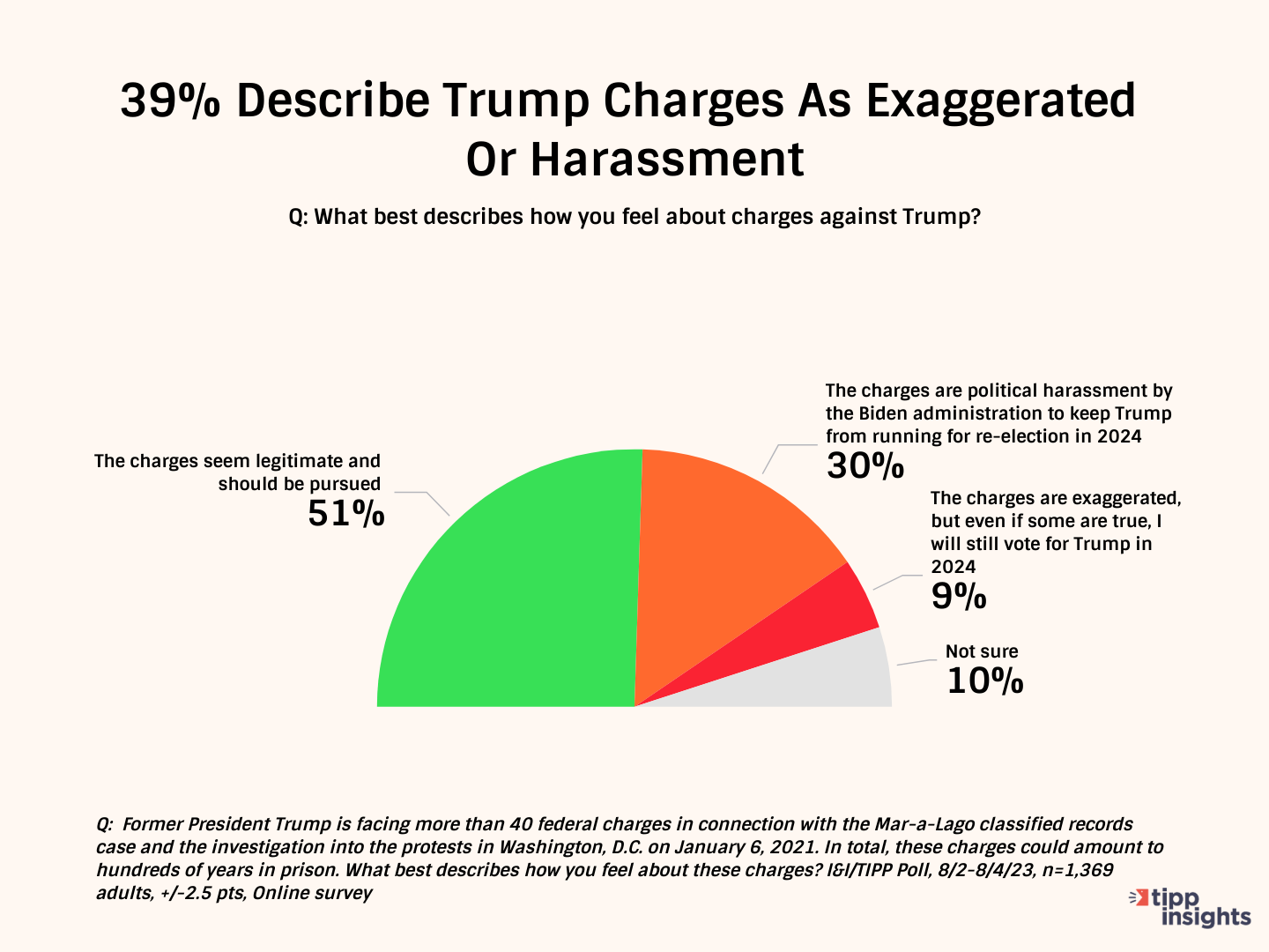 “Former President Trump is facing more than 40 federal charges in connection with the Mar-a-Lago classified records case and the investigation into the protests in Washington, D.C. on January 6, 2021. In total, these charges could amount to hundreds of years in prison. What best describes how you feel about these charges?”