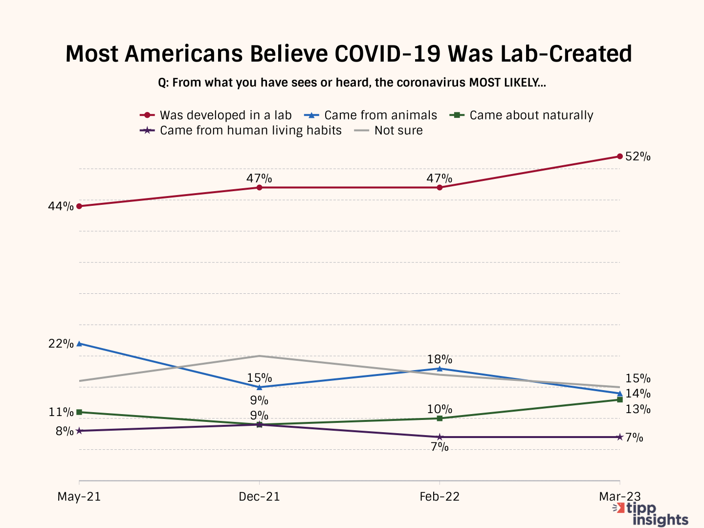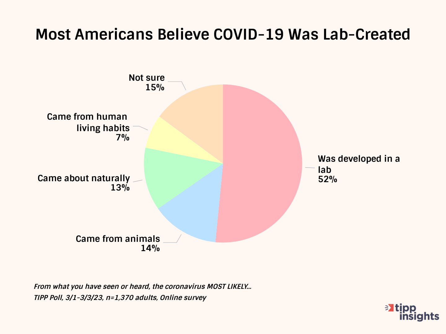 A Tipp Insights poll provided exclusively to DailyMail.com shows that 52 percent of US adults subscribe to the 'lab leak' theory, while only small shares of respondents said the virus came about naturally or from animals.