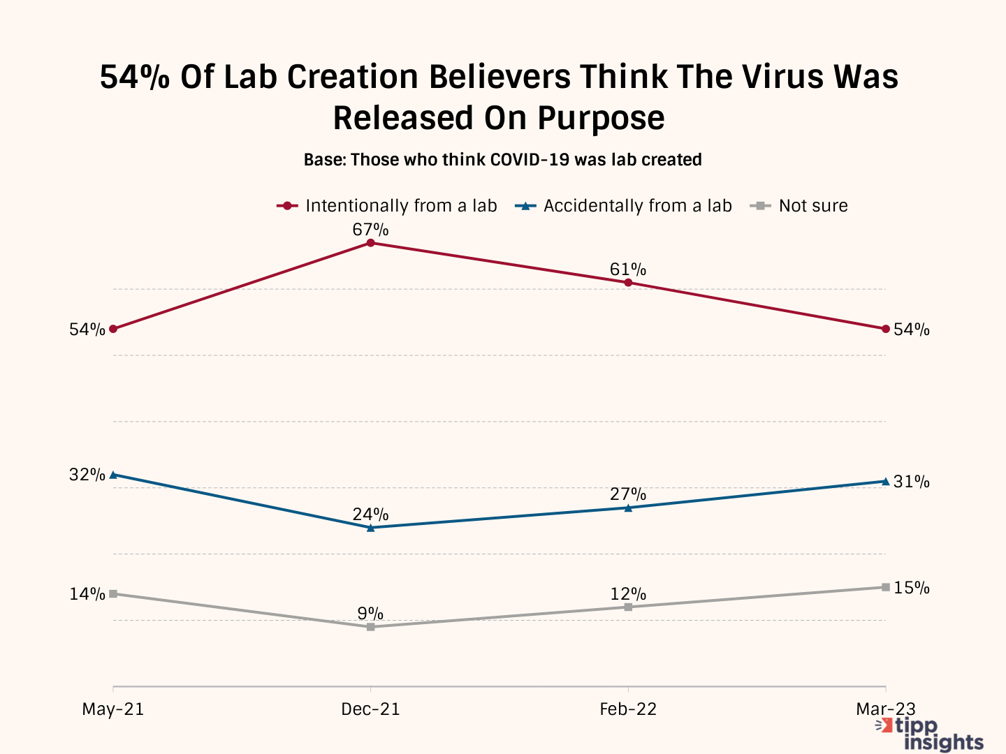 Of those who tout the lab leak theory, most of them — 54 percent — say Covid-19 was released into the population deliberately, while only 31 percent say the pathogen escaped by accident.