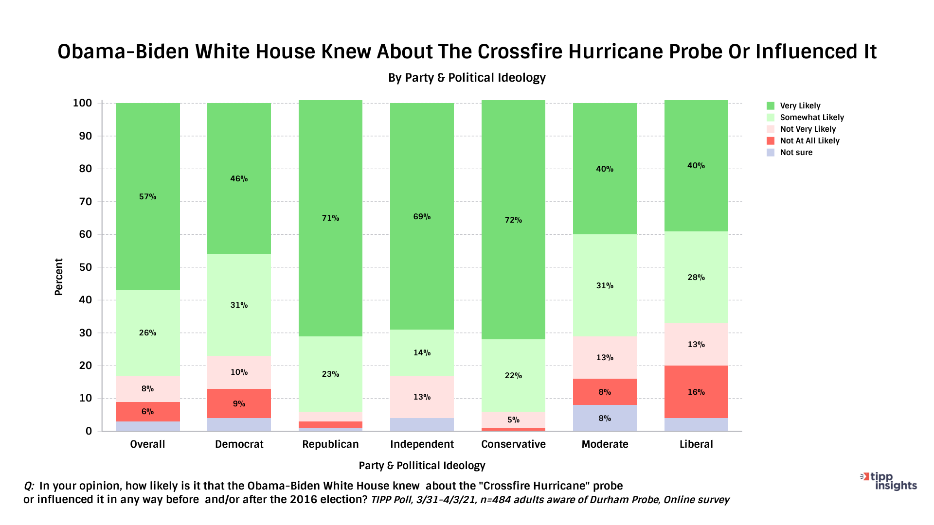 Eighty-three percent of those aware of the Durham investigation believe the Obama administration was aware of or influenced the "Crossfire Hurricane" investigation.