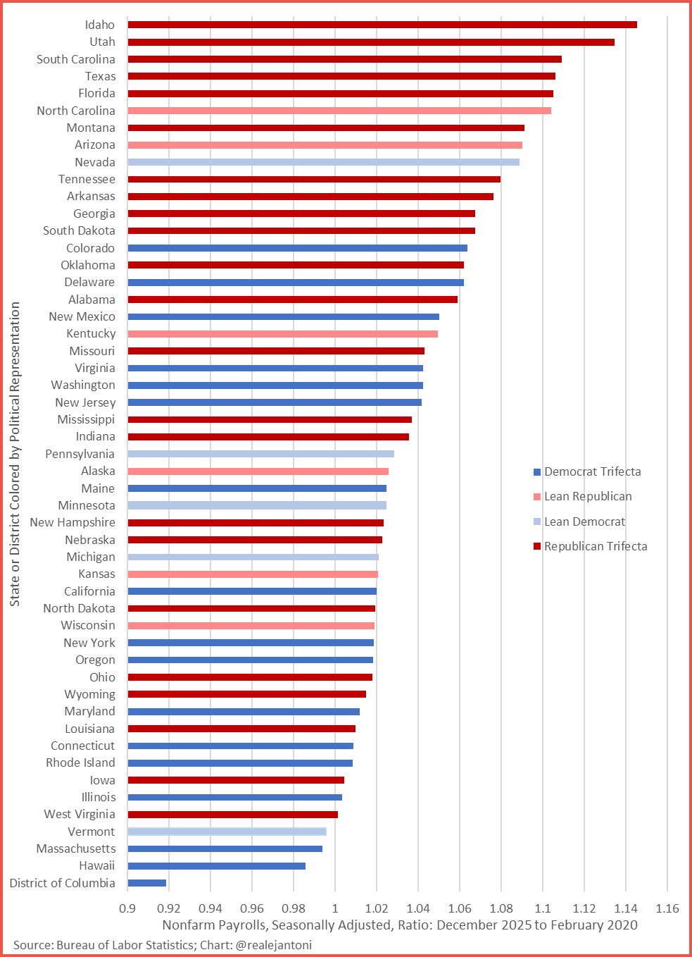 The chart highlights how job growth has been uneven, reflecting differences in population shifts, industry mix, and state economic conditions.