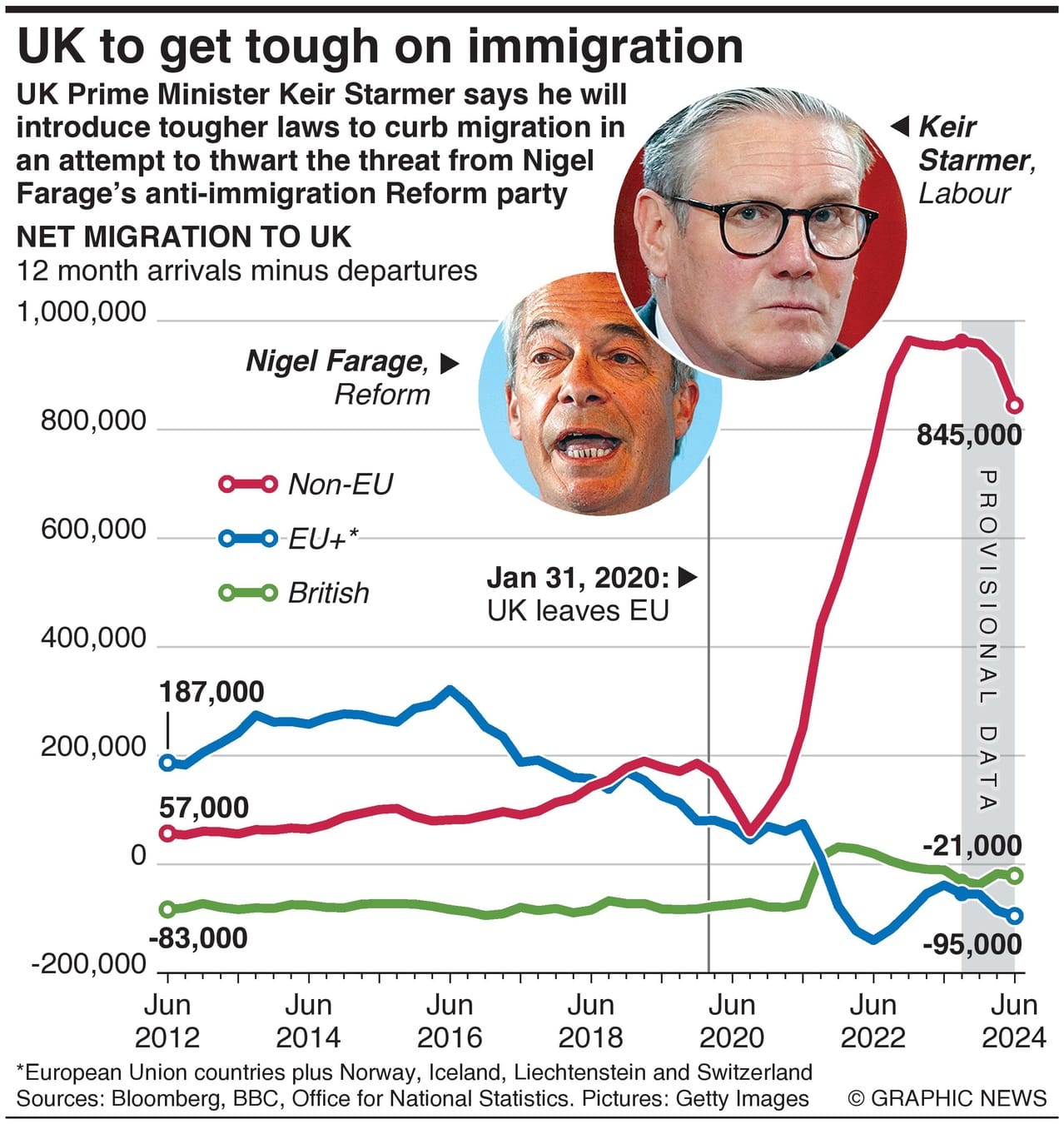 The UK’s recent surge in net migration, especially post-Brexit, has intensified pressure on Labour to act, as Nigel Farage’s Reform party capitalizes on public frustration. The data makes clear why Starmer now faces a Denmark-style dilemma.
