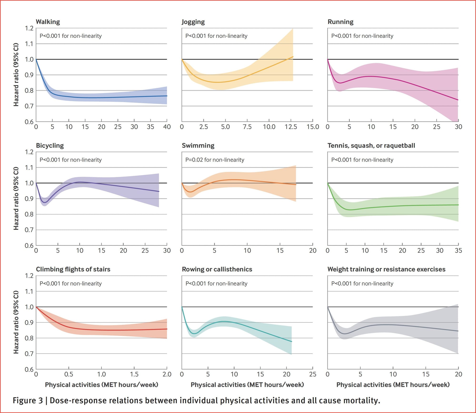 The biggest health payoff comes from going from no exercise to some exercise. Walking, light jogging, cycling, swimming, or lifting weights just a few hours a week sharply lowers the risk of early death. Doing more still helps, but the gains are much smaller. You don’t need extreme workouts—regular, moderate activity delivers most of the benefit.