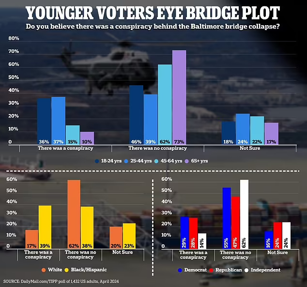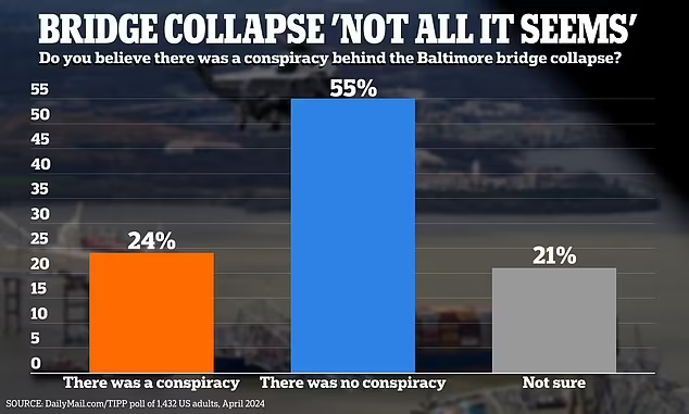 Nearly a quarter of US adults say the Baltimore bridge collapse was not an accident and attribute it to a conspiracy theory, our first-of-its-kind DailyMail.com/TIPP poll shows.