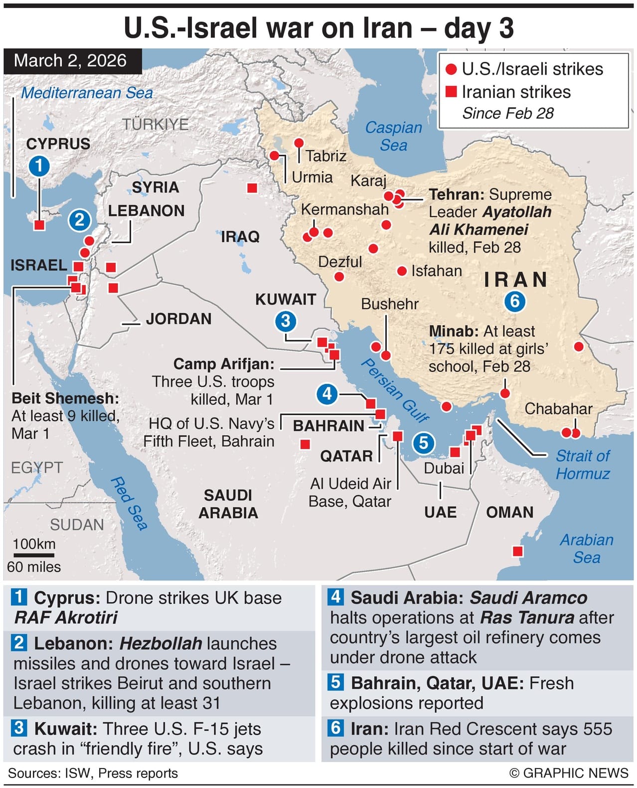 The U.S.-Israeli air campaign against Iran has intensified, with the conflict expanding to Lebanon as Israel responds to strikes by Hezbollah, while Tehran fires missiles and drones at Israel, Gulf states, and a British air base in distant Cyprus.