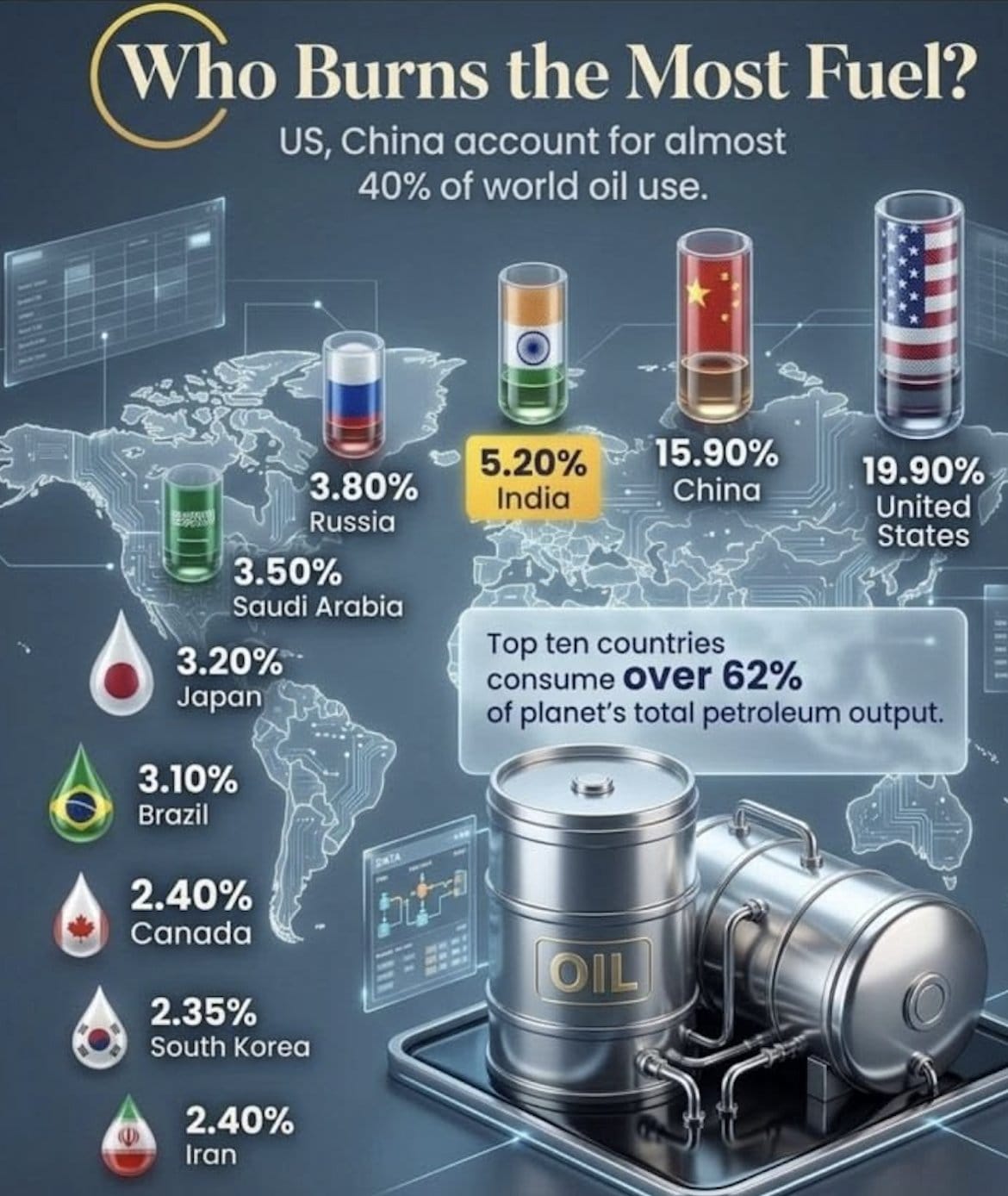 The U.S. and China together consume roughly 40% of the world’s oil. The top 10 countries account for over 60%. Demand is not evenly spread. It is highly concentrated and geopolitically sensitive. When supply is disrupted, the reaction is driven by a handful of major buyers.