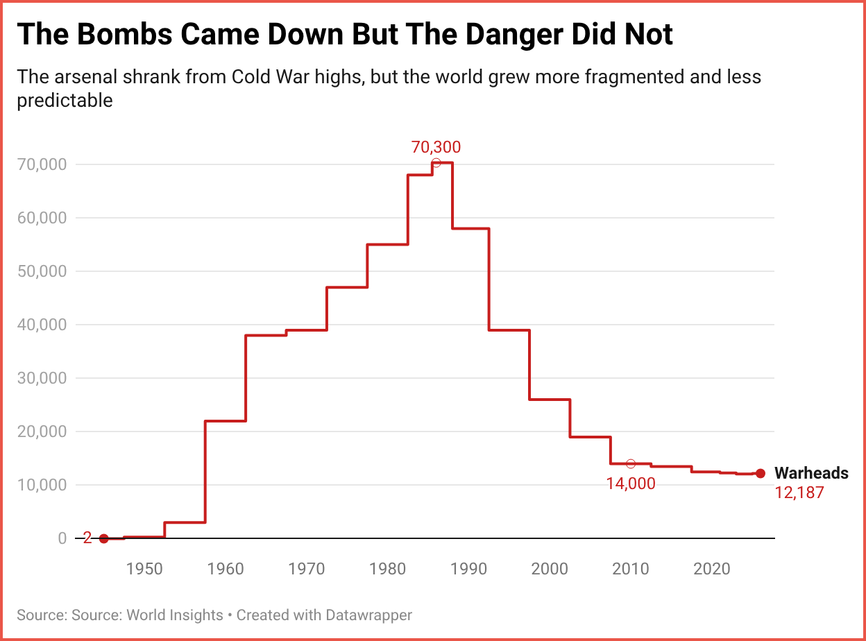 Global nuclear warheads have fallen sharply from Cold War peaks of ~70,000 to about 12,000 today. But lower numbers have not reduced risk. The weapons are more precise, and the geopolitical environment is less stable. The world is less armed than before, but not necessarily safer.
