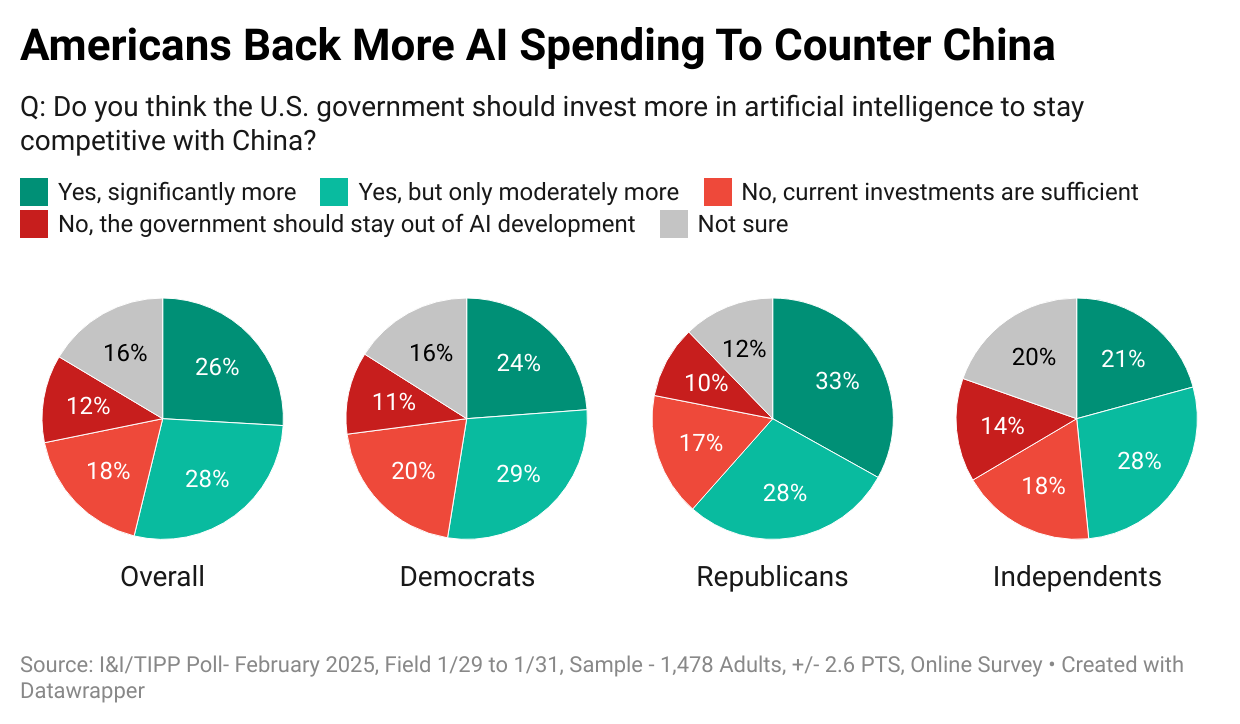This pattern of ideological consensus continued with the second question: “Do you think the U.S. government should invest more in artificial intelligence to stay competitive with China?”