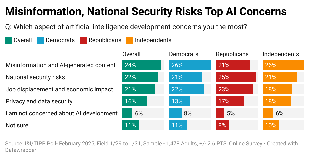 In descending order, respondents replied: “Misinformation and AI-generated content” (24%); “National security risks” (22%); “Job displacement and economic impact” (21%); “Privacy and data security” (16%); “I am not concerned about AI development” (6%); and “Not sure” (11%).