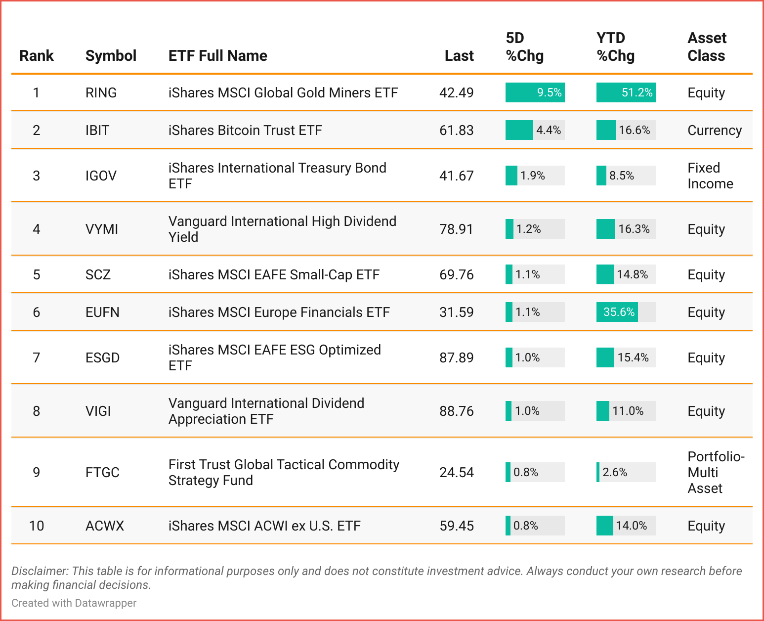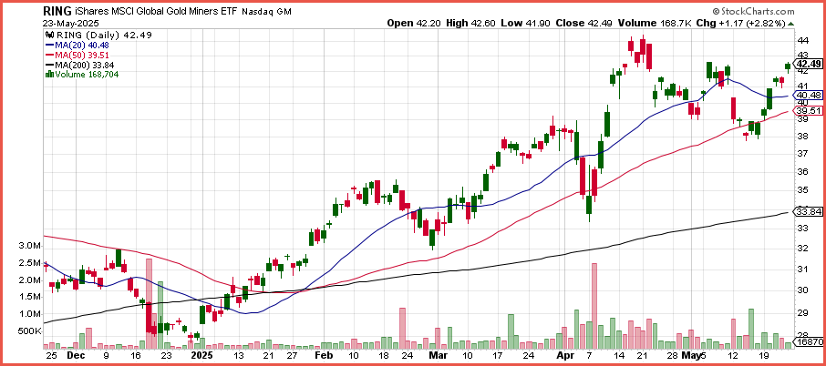 RING is the iShares MSCI Global Gold Miners ETF, offering exposure to global companies primarily focused on gold mining.