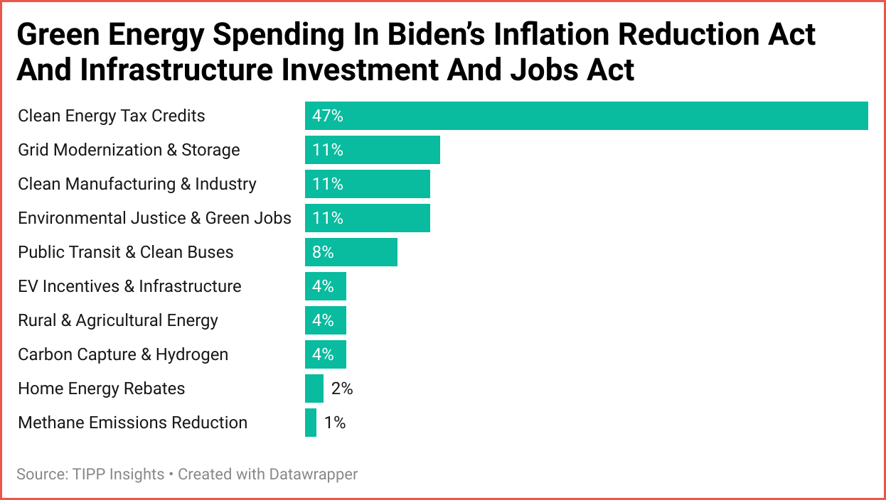 The Inflation Reduction Act (IRA) 2022 contained "Climate and energy investments" of approximately $369 billion over 10 years. These included $270 billion for clean energy tax credits to support wind, solar, geothermal, and other renewables; clean hydrogen production; and carbon capture and storage technologies. Buyers of electric vehicles would get up to a $7,500 tax credit for new EVs and up to a $4,000 tax credit for used EVs (with income and manufacturing origin restrictions). Tax credits and funding for domestic manufacturing of solar panels, wind turbines, batteries, and critical minerals exceeded $60 billion. Rebates for energy-efficient appliance upgrades, heat pumps, insulation, and home weatherization exceeded $60 billion under the Green Jobs and Environmental Justice banner.