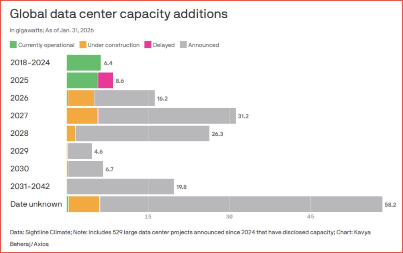 Global data-center capacity is set to surge as the AI boom accelerates. Projects expected to come online by 2027 alone could exceed 30 gigawatts, reflecting enormous demand for computing power and the energy needed to support next-generation AI infrastructure.