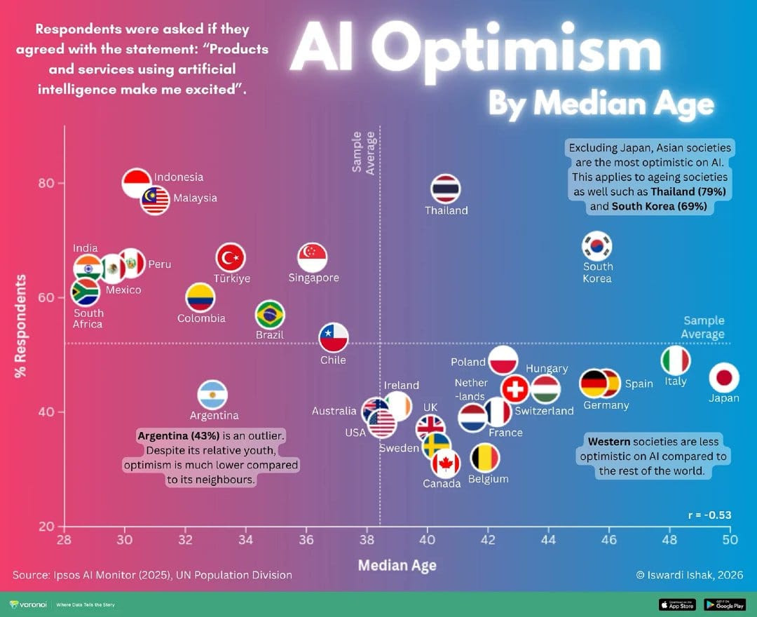 Survey data show countries with younger populations tend to be more optimistic about artificial intelligence, while older societies are generally more cautious. Emerging economies across Southeast Asia, Latin America, and parts of Africa show stronger excitement about AI compared with Europe, Japan, and North America.