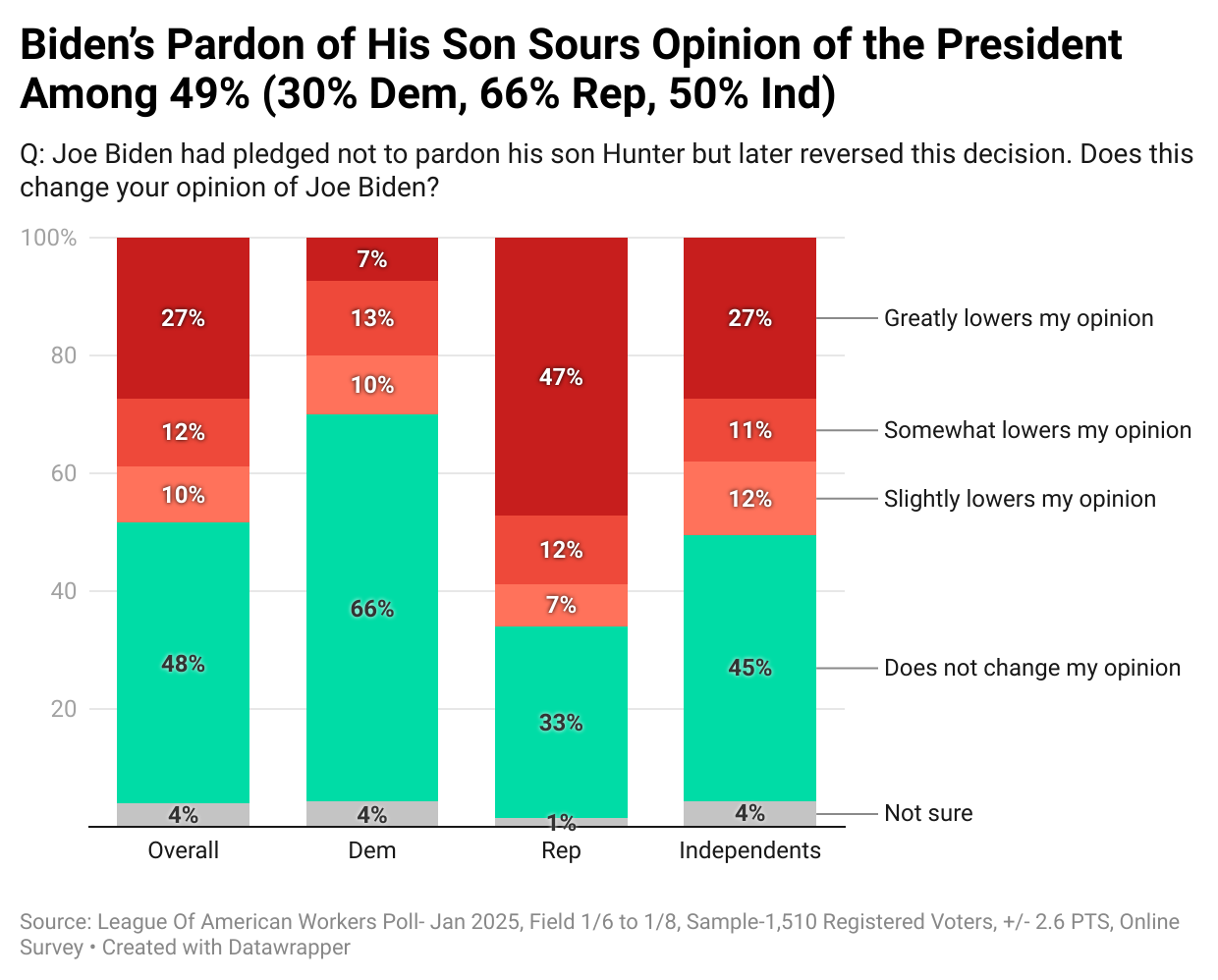 Our polling data suggests Biden’s decision significantly impacted his credibility among voters, with nearly half expressing disapproval. The latest League of American Workers Poll of 1,510 registered voters conducted earlier this month by TIPP shows that nearly half (49%) of the respondents mentioned that Biden’s action lowered their opinion of the President. Two-thirds of Democrats approved Biden’s pardon of his son. However, the dissatisfied included 30% of Democrats, 66% of Republicans, and 50% of independents.