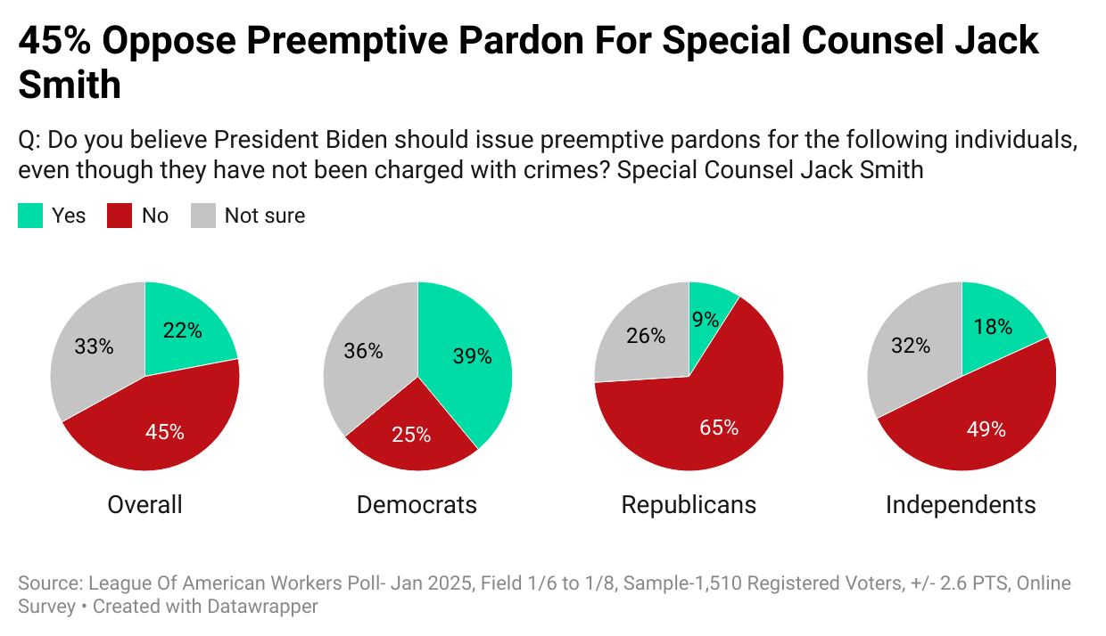 Attorney General Merrick Garland appointed Special Counsel Jack Smith, who pursued 34 criminal charges against Trump with the DOJ's backing. The charges were brought by D.C. grand juries and overseen by Judge Tanya Chutkan, whose repeated rulings against Trump invited the ire of the Supreme Court. Only one in five (22%) support a preemptive pardon for Jack Smith. 45% oppose it. Notably, one-third (33%) are unsure.