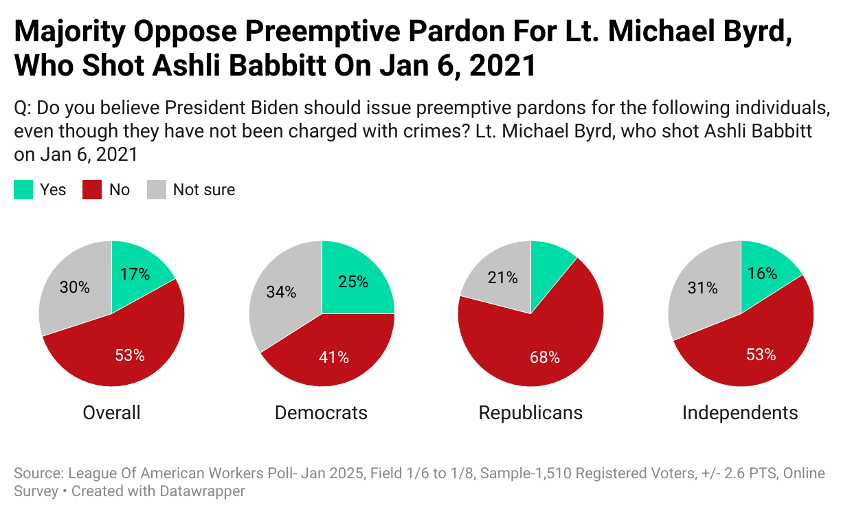 The survey reveals that 53% of Americans oppose pardoning Lt. Michael Byrd, with opposition highest among Republicans (68%). Democrats are more divided, 34% opposing and 41% supporting, while independents align with the overall trend at 53% opposition.