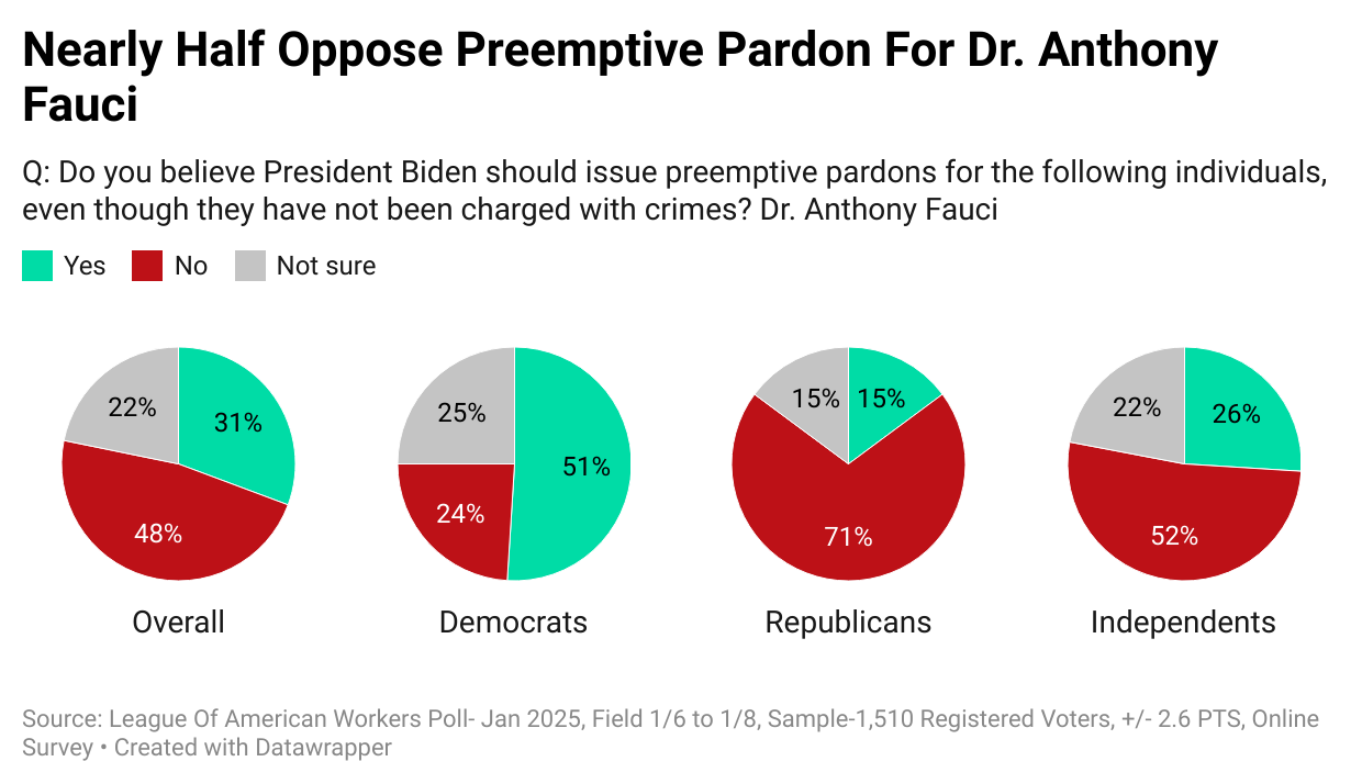 Only a third (31%) favor a preemptive pardon for Dr. Fauci. Nearly half (48%) are against it, with Republicans strongly opposing it (71%). In contrast, 51% of Democrats back a pardon, reflecting Fauci’s polarizing role during the pandemic. A majority (52%) of independents also oppose the idea.