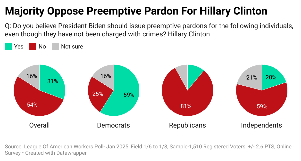Meanwhile, a majority of Americans (54%) oppose pardoning Hillary Clinton. Republicans strongly reject the idea (81%), while Democrats largely support it (59%). Independents also lean against pardoning Clinton, with 59% in opposition.