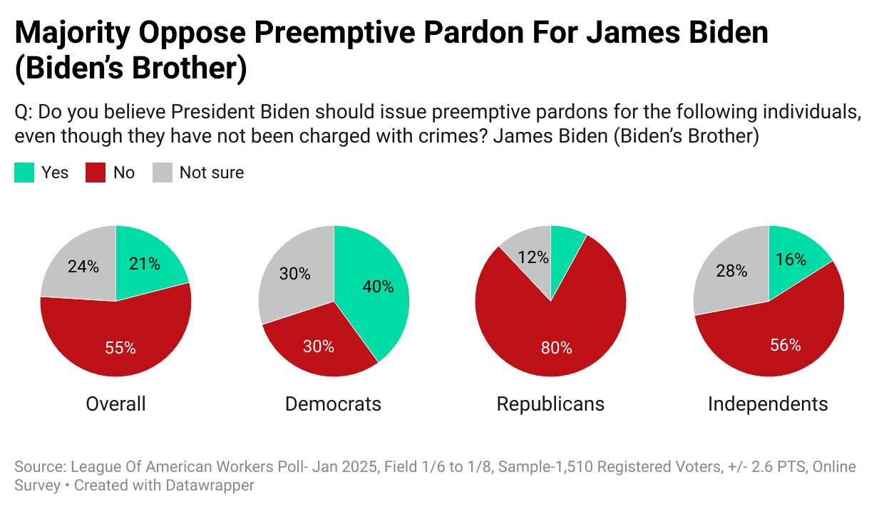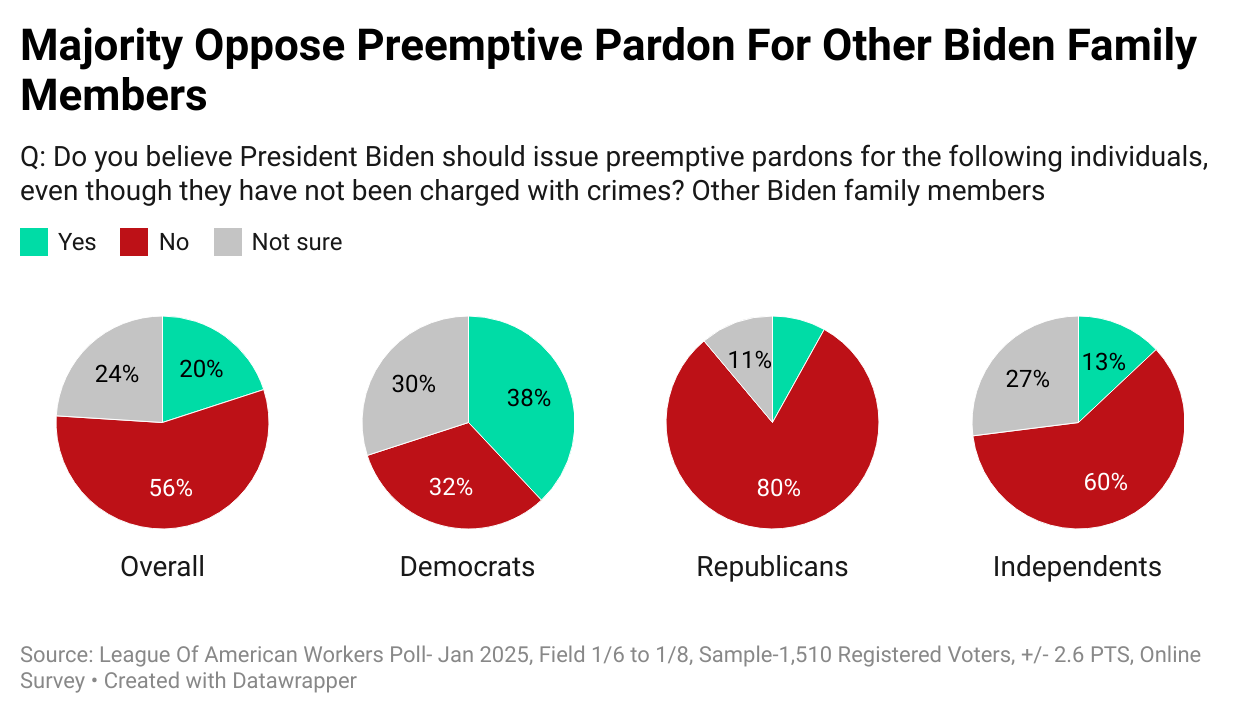 Next, the survey also tested blanket preemptive pardons for “other” Biden family members. The results were very similar to those of James Biden: 56% opposed the idea, and only 20% supported it.
