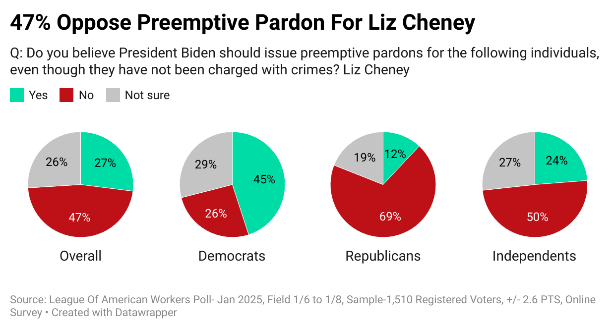 Liz Cheney’s potential pardon divides Americans. While 26% support it, 47% oppose it. Republicans show strong resistance (69%), while Democrats (45%) are more supportive. Independents lean slightly against, with 50% opposed.