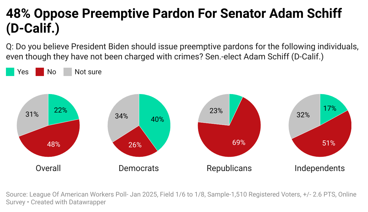 Opinions on a preemptive pardon for Senator Adam Schiff are divided. Nearly half (48%) oppose a pardon, while 22% support it. Republicans strongly oppose (69%), while Democrats are more supportive (40%). Independents are split, with 17% for and 51% against.