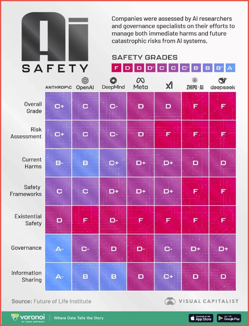 An AI safety scorecard shows wide gaps in how leading tech companies manage risks from advanced AI systems. While a few firms score relatively better on governance and information sharing, most receive low marks on existential risk, safety frameworks, and oversight, highlighting how far industry practices lag behind the speed of AI deployment.