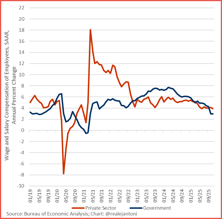 The chart shows wage growth in the private sector once again outpacing that of government employees. After moving closely together in recent years, private-sector pay gains have edged ahead, pointing to stronger labor demand and compensation pressures outside government. The trend supports the idea that economic momentum is increasingly being driven by the private sector.