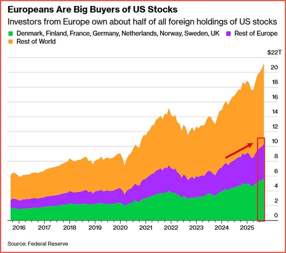 European investors now hold a record $10.4 trillion in U.S. equities, nearly doubling (+91%) in three years. Major European countries account for about 55% of Europe’s U.S. equity holdings, meaning Europe represents roughly half of all foreign ownership of U.S. stocks. The surge underscores how U.S. markets continue to attract global capital—even amid trade tensions.