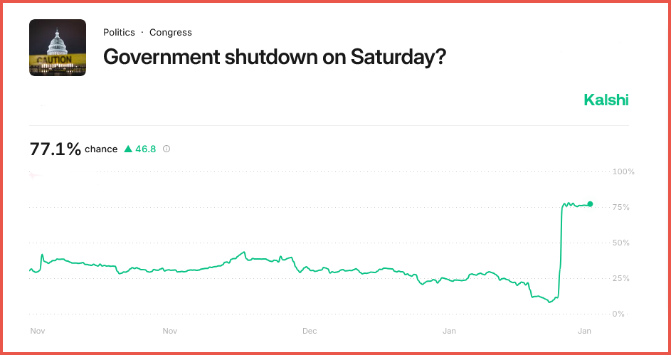 Prediction markets have sharply raised the probability of a U.S. government shutdown, now putting the odds at around 77% as the deadline approaches. The late surge reflects growing skepticism that lawmakers will reach a funding deal in time—a familiar pattern in past shutdown standoffs.