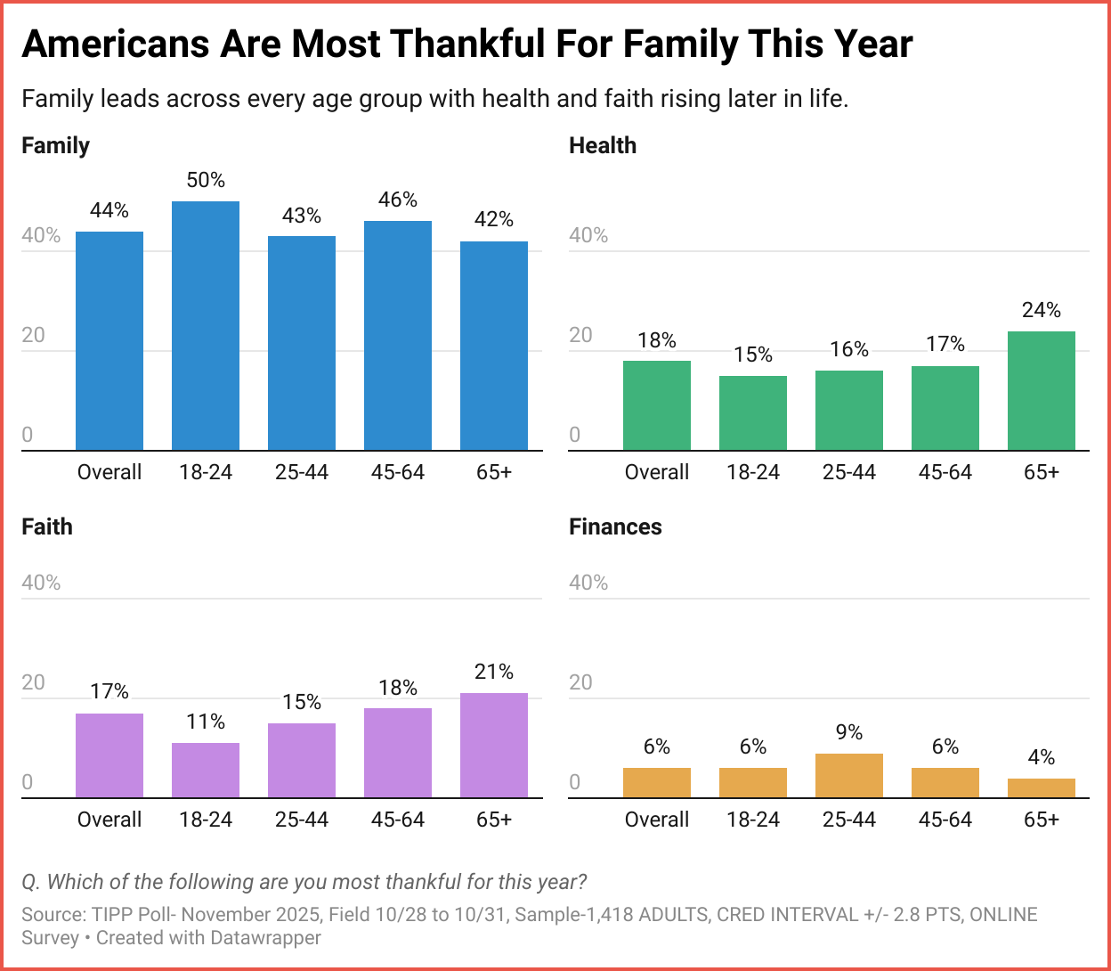 The numbers paint a hopeful picture. The largest segment, 44%, stated they were most grateful for their family and relationships. For about a fifth (18%), health was the number one pick. People's faith and spirituality ranked third at 17%.