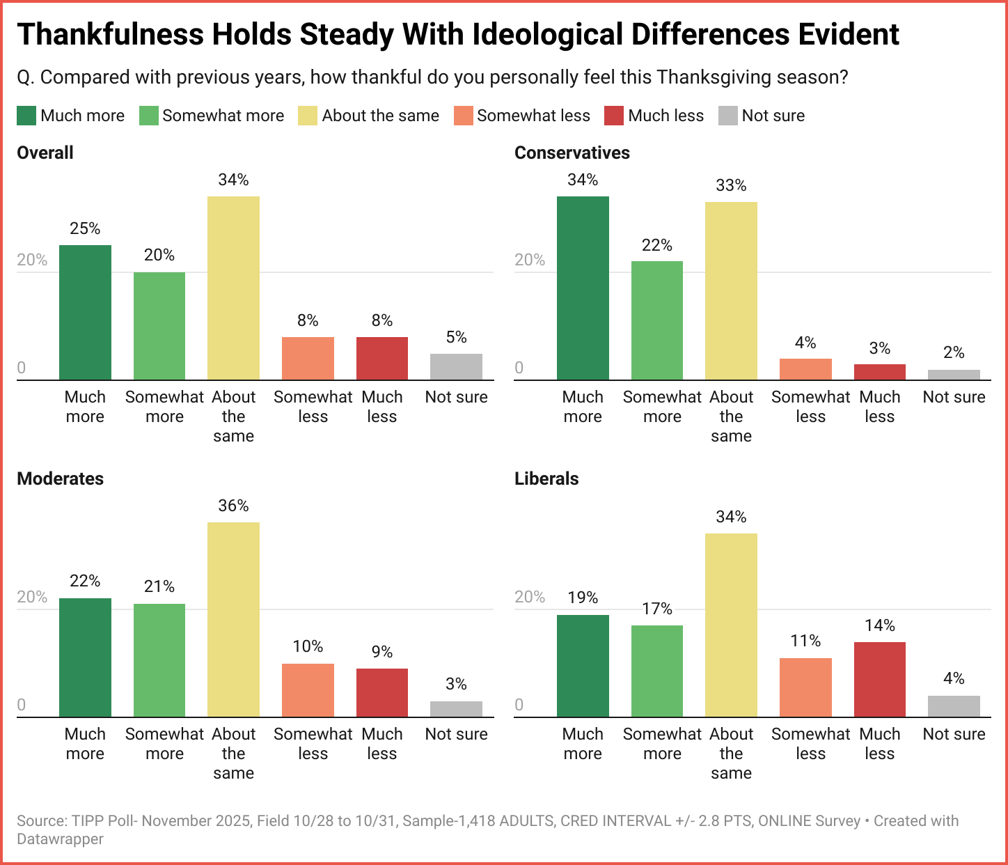 On the occasion of Thanksgiving, TIPP Poll asked Americans nationwide how thankful they felt this year compared to previous years. Hearteningly, 45% said they felt more grateful in 2025 than they had in the years prior, with 25% declaring that they felt 'much more grateful.' Only 16% felt less thankful this year. About the third, 34%, stated they did not feel any different this year.
