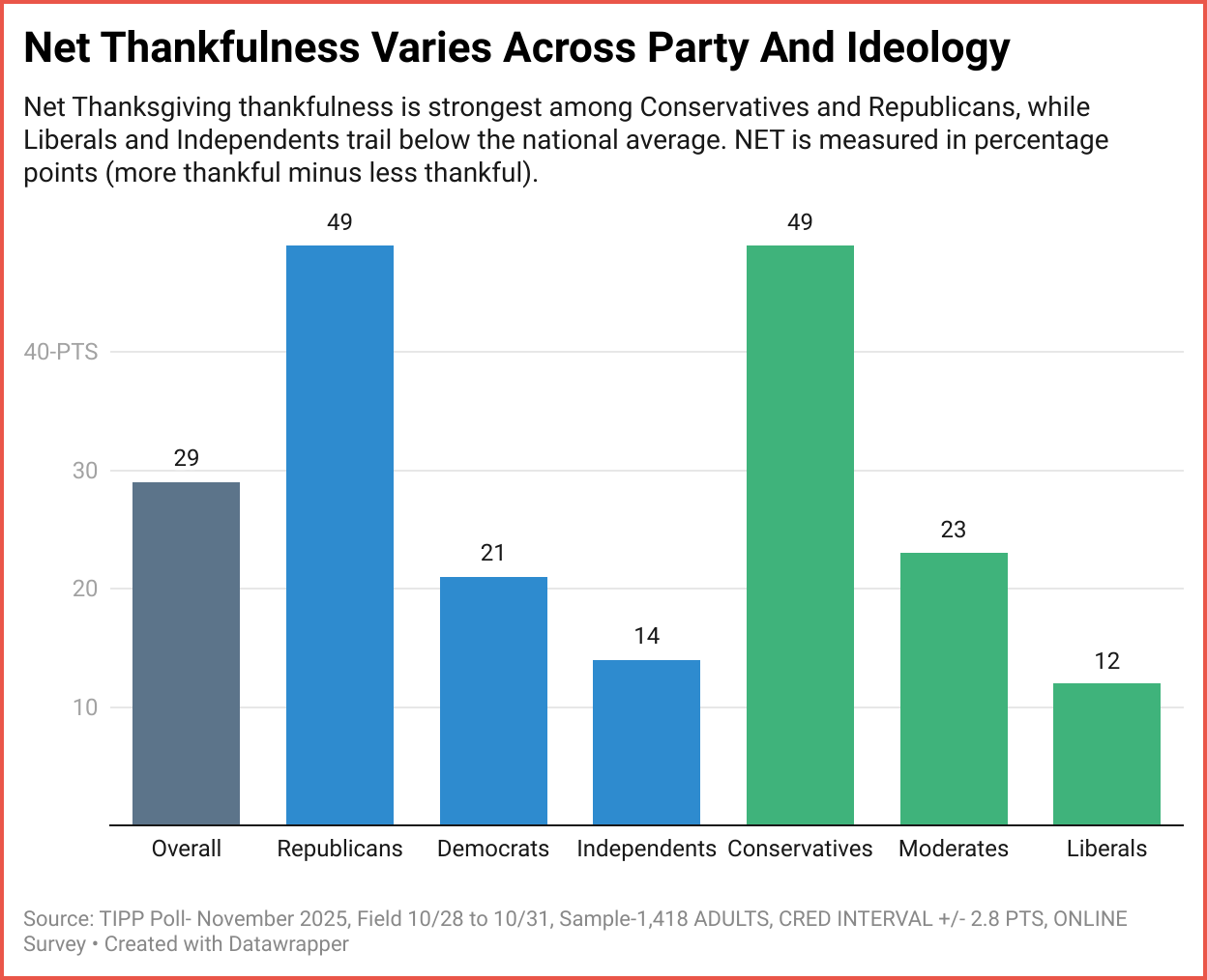 To better illustrate how emotional direction differs across political identity and worldview, the NET measure below shows the percentage-point margin between those who feel more thankful and those who feel less thankful.