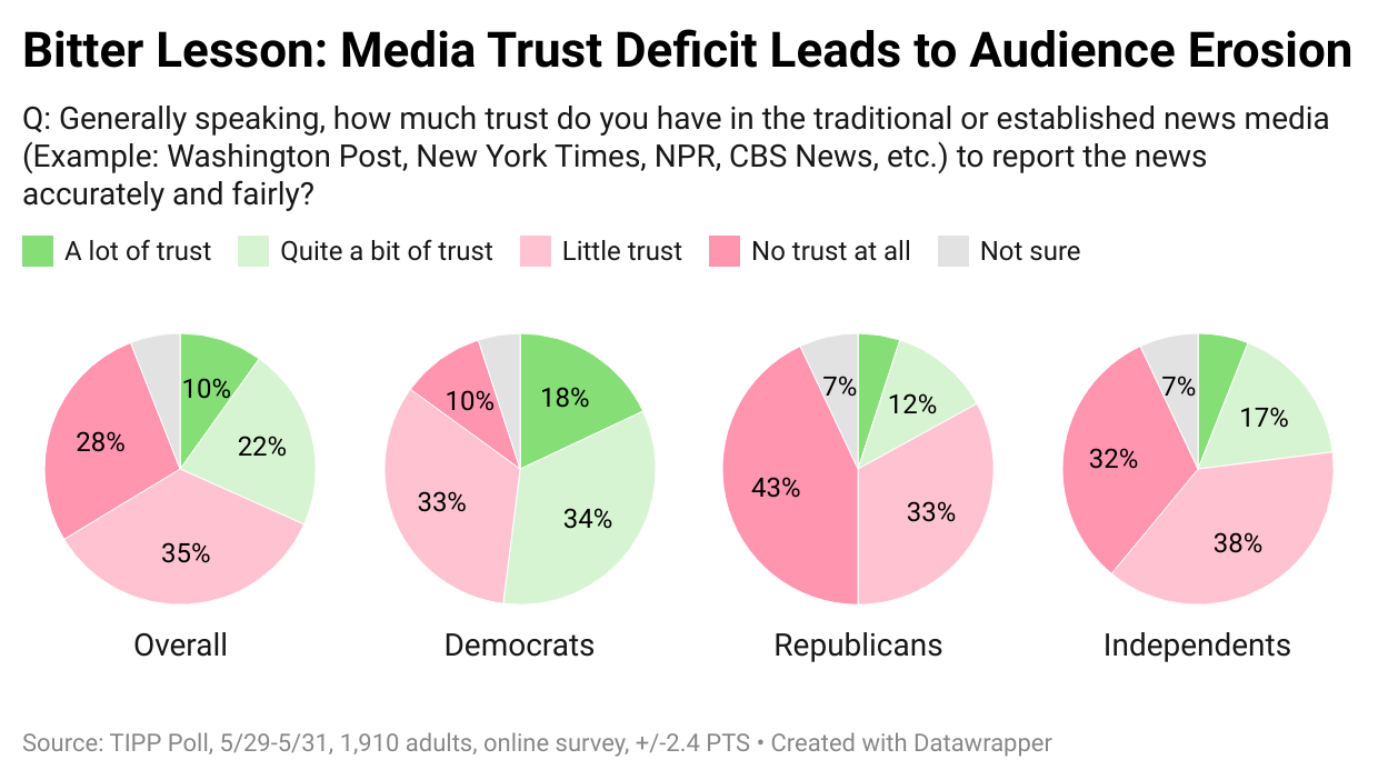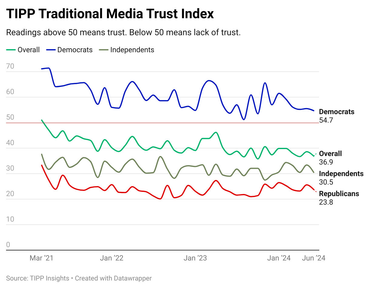 For example, in a TIPP Poll completed in late May, only 32% of Americans trust the traditional media, and 63% have little or no trust at all. 52% of Democrats trust the media, while 76% of Republicans and 70% of independents don’t.