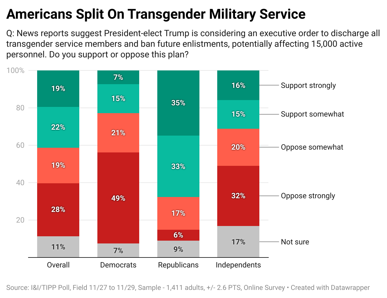 While no specific proposal has yet actually been put forward, the national online I&I/TIPP Poll asked this question: "News reports suggest President-elect Trump is considering an executive order to discharge all transgender service members and ban future enlistments, potentially affecting 15,000 active personnel. Do you support or oppose this plan?"