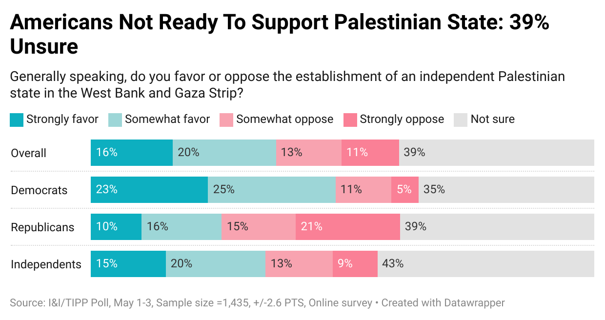 On this question, the biggest response was "not sure," with 39%. A small 36% plurality either "strongly favored" (16%) or "somewhat favored" (20%) a Palestinian state, versus 24% that rejected the move either "strongly" (11%) or "somewhat" (13%).