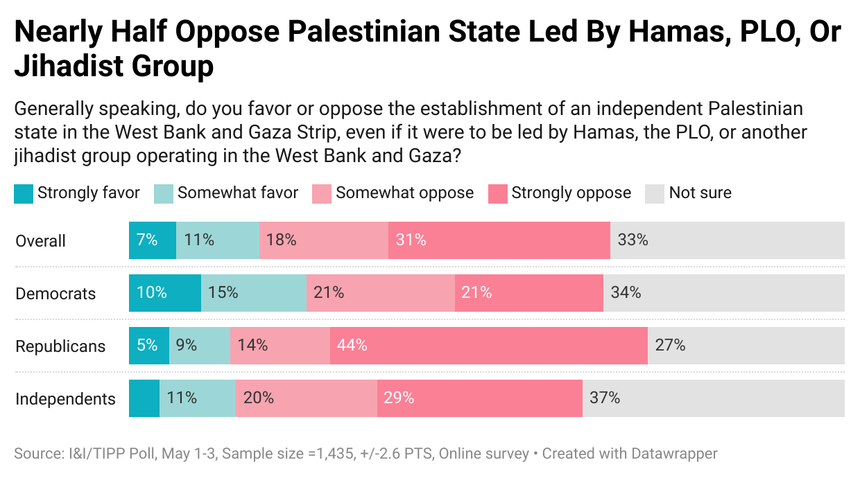 On this, Americans were adamant: Again, by more than 2-to-1, or 49% to 18%, they rejected the idea of a Palestinian state on Israel's border led by the PLO, Hamas, or other extremist Islamist group.