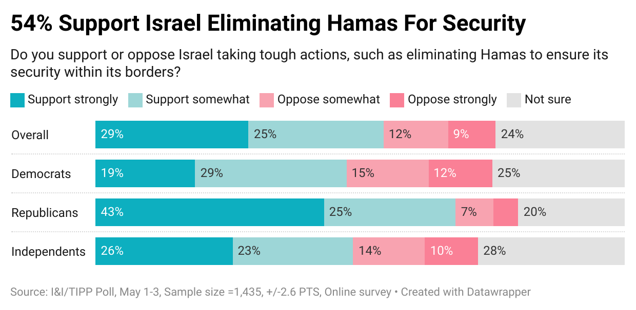 The national online poll, taken from May 1-3, asked 1,435 adults the following question: "Do you support or oppose Israel taking tough actions, such as eliminating Hamas to ensure its security within its borders?"