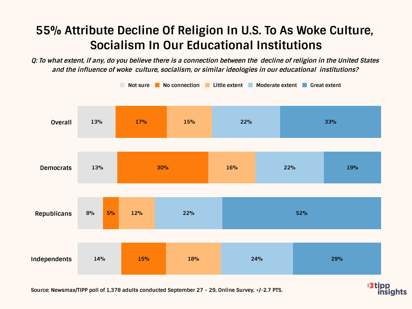 To the question, "To what extent, if any, do you believe there is a connection between the decline of religion in the United States and the influence of woke culture, socialism, or similar ideologies in our educational institutions?" 56% of survey participants perceived a "great/moderate" link. But, one-third, or 32%, saw "little or no connection" linking the influence of such factors to the decline in religious faith. The rest were unsure.