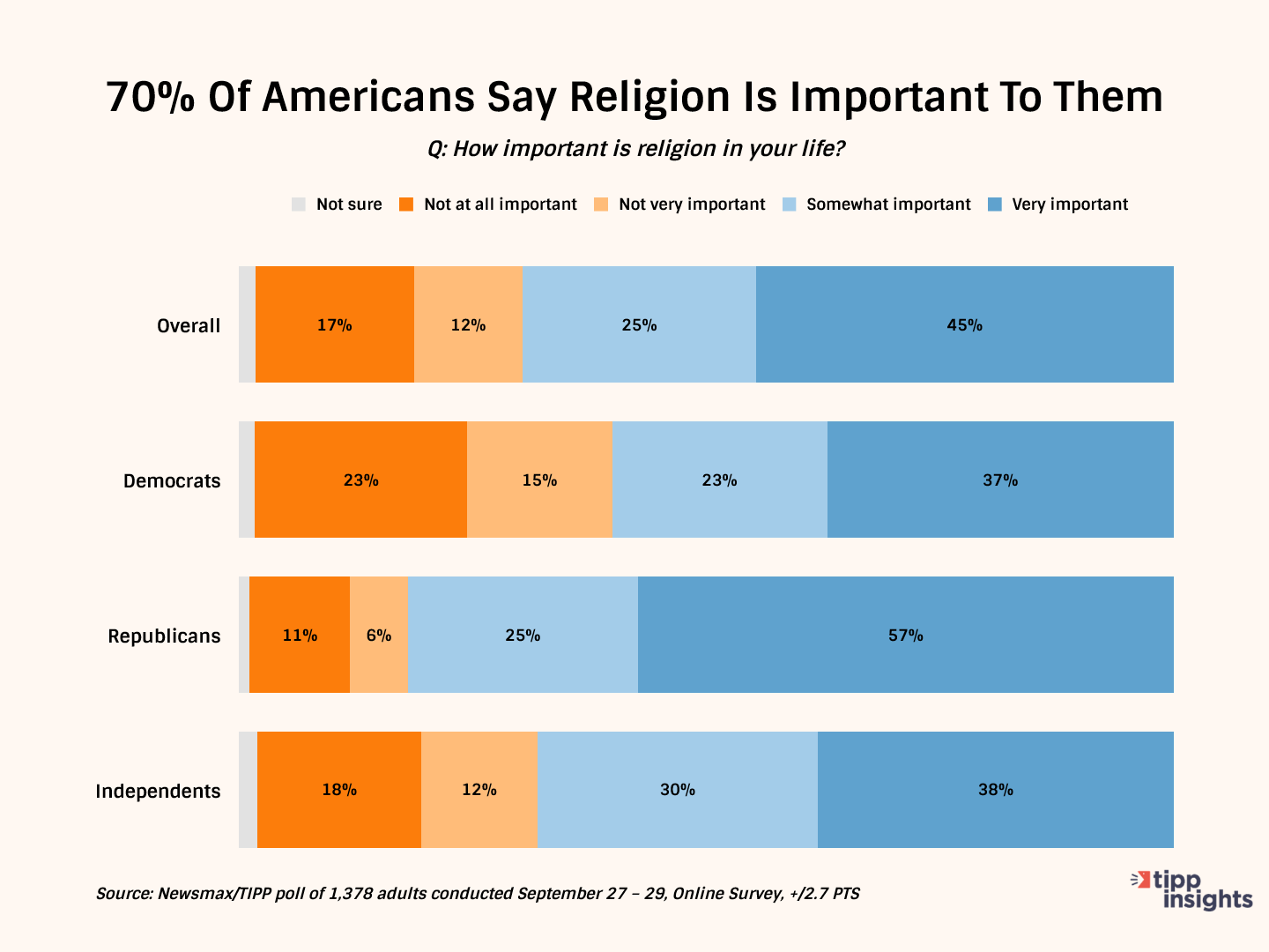 Faith and religion continue to guide Americans in their daily lives. For 70% of survey respondents, religion is an "important" part of their life, of which 45% hold their faith as "very important." The demographics posting above-average scores are: