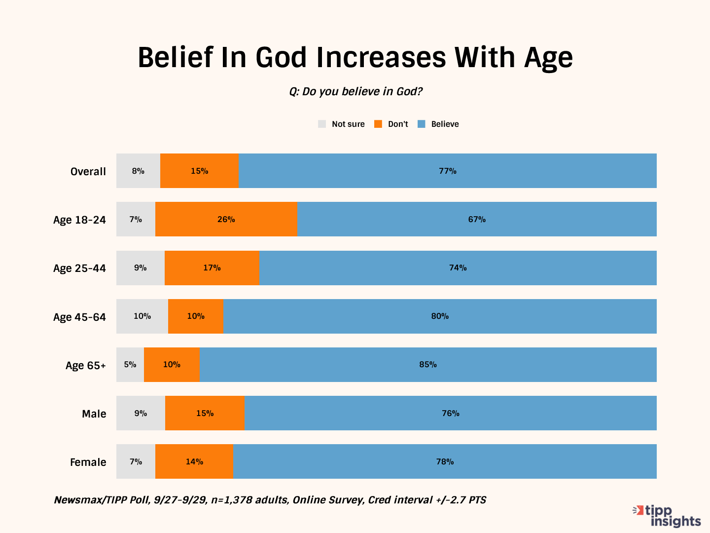 According to a recent nationwide Newsmax/TIPP Poll of 1,378 adults, a clear majority, 77%, believe in God. Not surprising in a nation where 'In God We Trust' is the official motto. A small fraction, 15%, did not believe in a higher power.